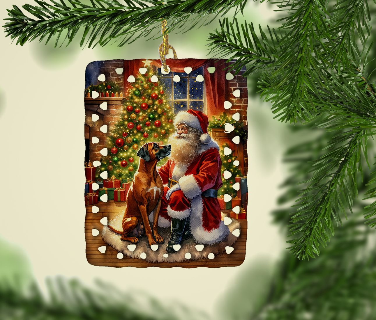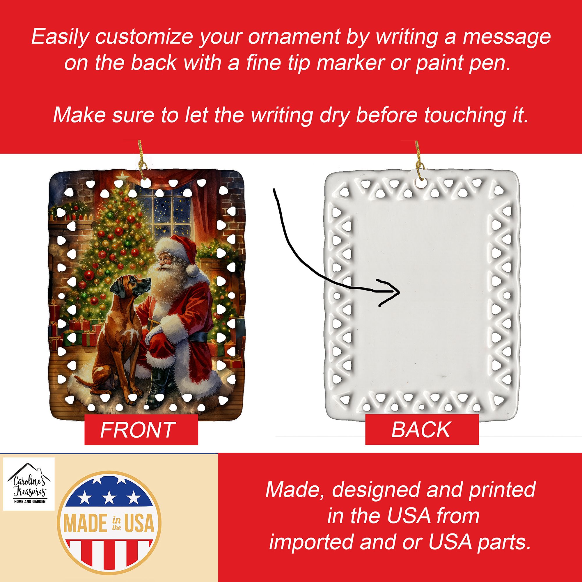 Porcelain Ornament featuring breed specific Rhodesian Ridgeback artwork. Celebrate Christmas with this Christmas Ornament. Add a unique, personal touch to your holiday decor with our Rectangular Lattice Porcelain Ornament. Perfect for creating cherished memories, this high-quality ornament shines under festive lights, reflecting warmth and joy throughout your Christmas tree. Crafted with a glossy finish, it showcases vibrant, full-color artwork contributed by our talented artists, ensuring your tree is adorned with a burst of color and holiday spirit. What sets this Porcelain Ornament apart is its customizable white back. Use a paint pen or permanent marker to write a heartfelt message, commemorate a special year, or mark an unforgettable date, turning this ornament into a keepsake that will be treasured for years to come. For best results, allow any personalization to dry thoroughly before handling. Each ornament comes complete with a delicate gold cord, making it easy to hang and display. Proudly made in the USA, this ornament measures 3.375 x 2.625 inches and is a thoughtful gift for pet sitters, teachers, family members, or anyone who would appreciate a little extra holiday magic. Bring style, charm, and a touch of personal meaning to your Christmas tree with this beautifully designed ornament..