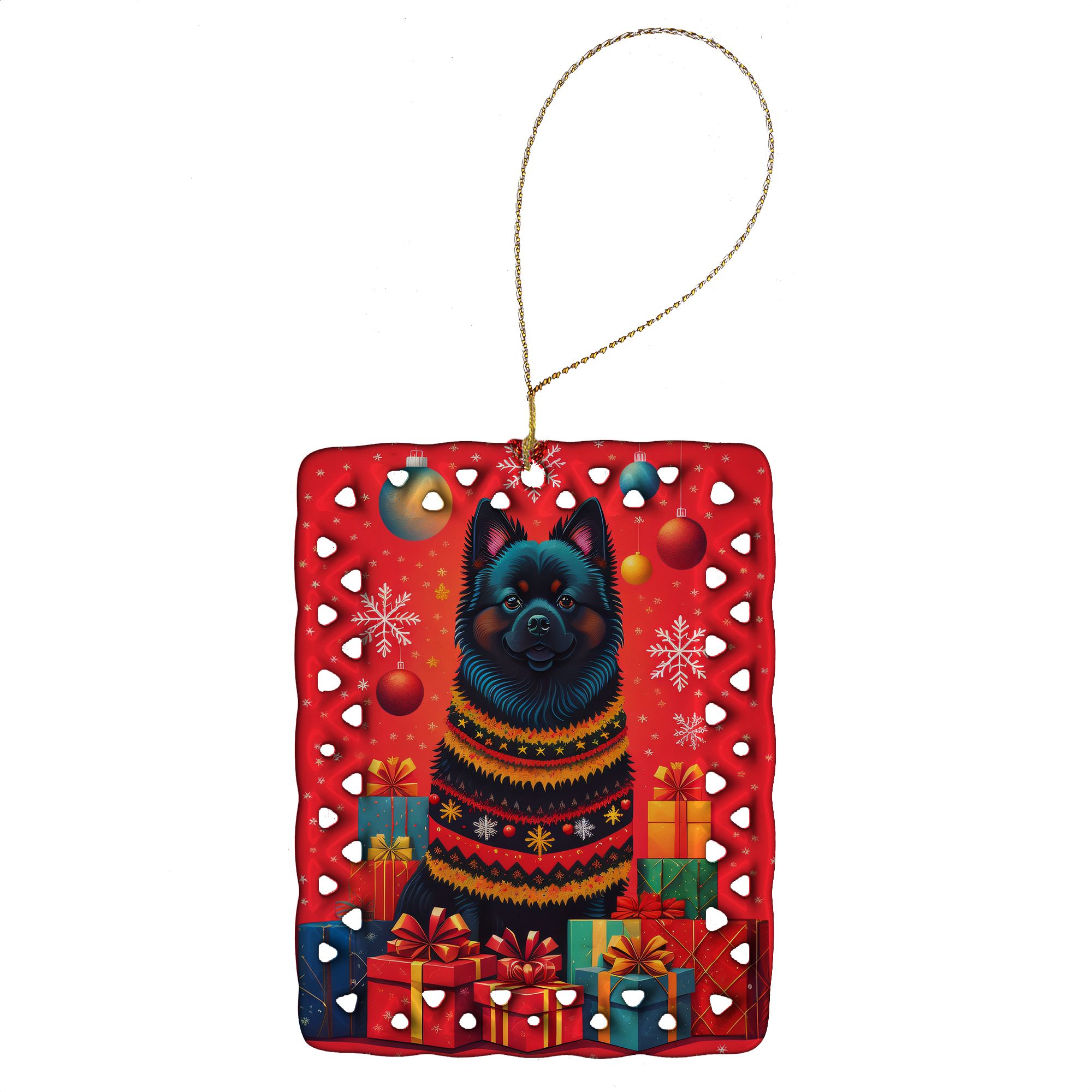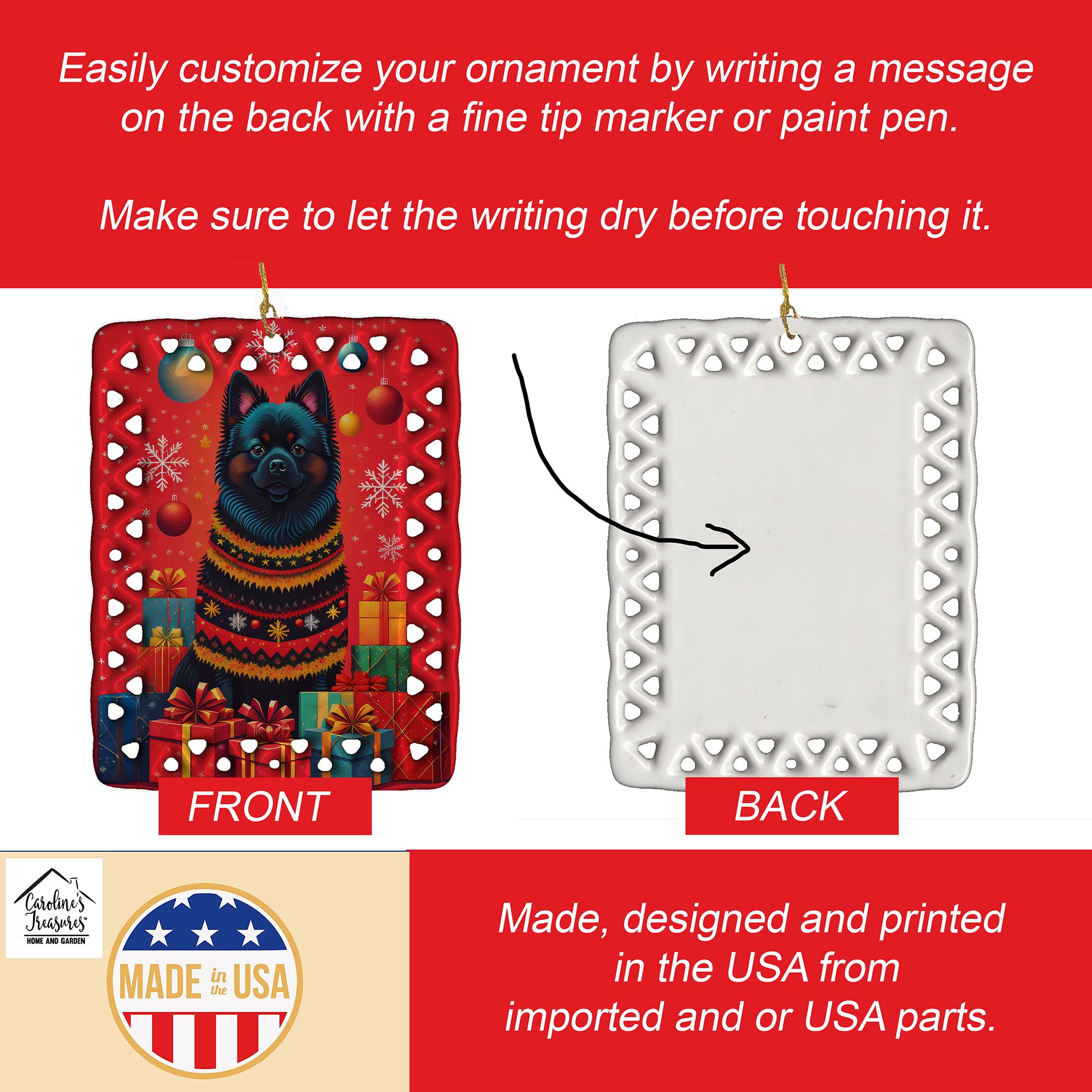 Porcelain Ornament featuring breed specific German Spitz artwork. Celebrate Christmas with this Christmas Ornament. Add a unique, personal touch to your holiday decor with our Rectangular Lattice Porcelain Ornament. Perfect for creating cherished memories, this high-quality ornament shines under festive lights, reflecting warmth and joy throughout your Christmas tree. Crafted with a glossy finish, it showcases vibrant, full-color artwork contributed by our talented artists, ensuring your tree is adorned with a burst of color and holiday spirit. What sets this Porcelain Ornament apart is its customizable white back. Use a paint pen or permanent marker to write a heartfelt message, commemorate a special year, or mark an unforgettable date, turning this ornament into a keepsake that will be treasured for years to come. For best results, allow any personalization to dry thoroughly before handling. Each ornament comes complete with a delicate gold cord, making it easy to hang and display. Proudly made in the USA, this ornament measures 3.375 x 2.625 inches and is a thoughtful gift for pet sitters, teachers, family members, or anyone who would appreciate a little extra holiday magic. Bring style, charm, and a touch of personal meaning to your Christmas tree with this beautifully designed ornament..