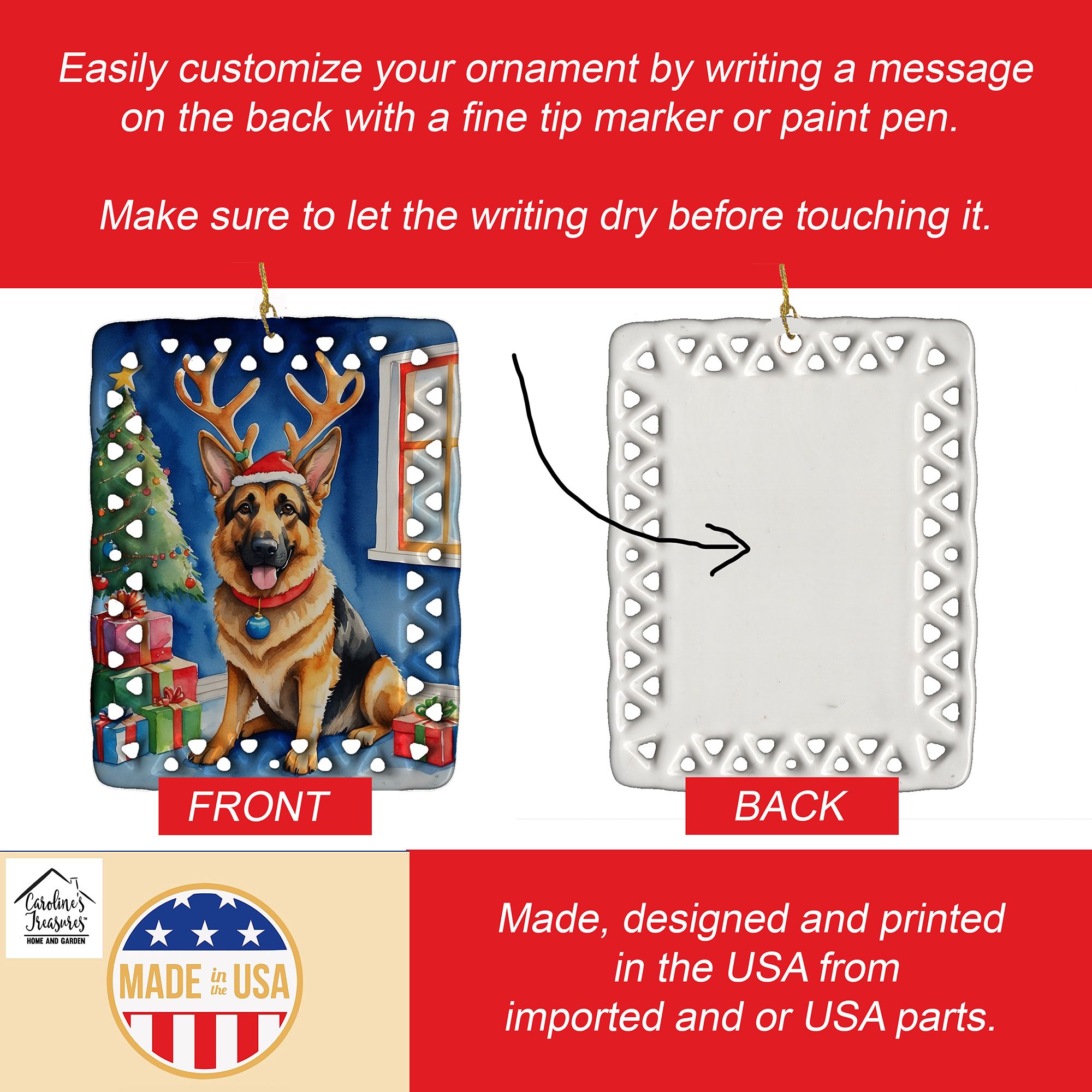 Porcelain Ornament featuring breed specific German Shepherd artwork. Celebrate Christmas with this Christmas Ornament. Add a unique, personal touch to your holiday decor with our Rectangular Lattice Porcelain Ornament. Perfect for creating cherished memories, this high-quality ornament shines under festive lights, reflecting warmth and joy throughout your Christmas tree. Crafted with a glossy finish, it showcases vibrant, full-color artwork contributed by our talented artists, ensuring your tree is adorned with a burst of color and holiday spirit. What sets this Porcelain Ornament apart is its customizable white back. Use a paint pen or permanent marker to write a heartfelt message, commemorate a special year, or mark an unforgettable date, turning this ornament into a keepsake that will be treasured for years to come. For best results, allow any personalization to dry thoroughly before handling. Each ornament comes complete with a delicate gold cord, making it easy to hang and display. Proudly made in the USA, this ornament measures 3.375 x 2.625 inches and is a thoughtful gift for pet sitters, teachers, family members, or anyone who would appreciate a little extra holiday magic. Bring style, charm, and a touch of personal meaning to your Christmas tree with this beautifully designed ornament..