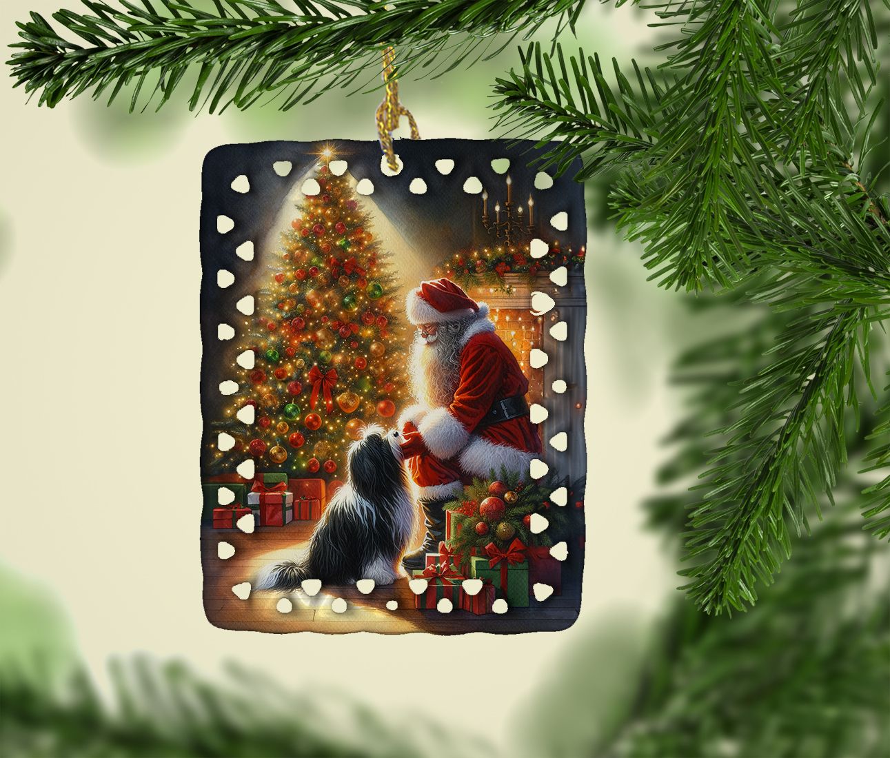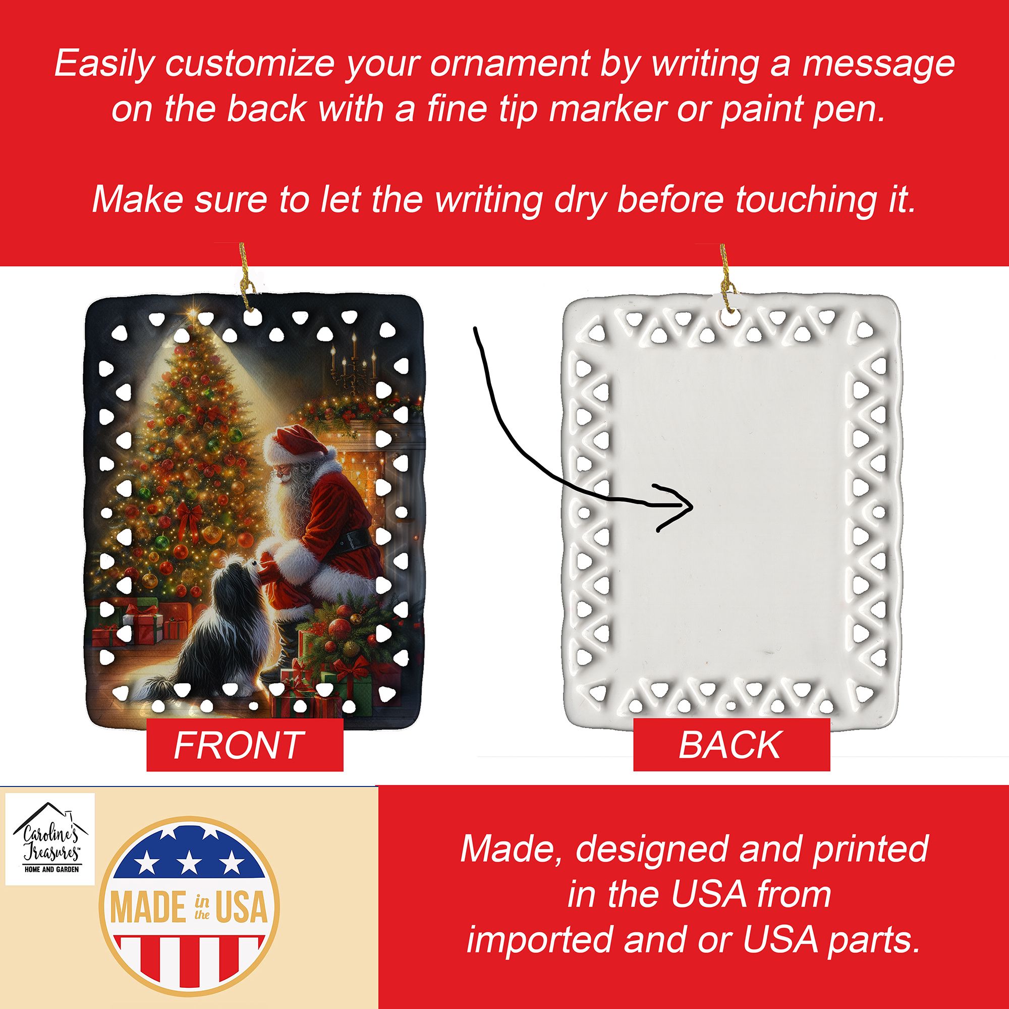 Porcelain Ornament featuring breed specific Tibetan Terrier artwork. Celebrate Christmas with this Christmas Ornament. Add a unique, personal touch to your holiday decor with our Rectangular Lattice Porcelain Ornament. Perfect for creating cherished memories, this high-quality ornament shines under festive lights, reflecting warmth and joy throughout your Christmas tree. Crafted with a glossy finish, it showcases vibrant, full-color artwork contributed by our talented artists, ensuring your tree is adorned with a burst of color and holiday spirit. What sets this Porcelain Ornament apart is its customizable white back. Use a paint pen or permanent marker to write a heartfelt message, commemorate a special year, or mark an unforgettable date, turning this ornament into a keepsake that will be treasured for years to come. For best results, allow any personalization to dry thoroughly before handling. Each ornament comes complete with a delicate gold cord, making it easy to hang and display. Proudly made in the USA, this ornament measures 3.375 x 2.625 inches and is a thoughtful gift for pet sitters, teachers, family members, or anyone who would appreciate a little extra holiday magic. Bring style, charm, and a touch of personal meaning to your Christmas tree with this beautifully designed ornament..