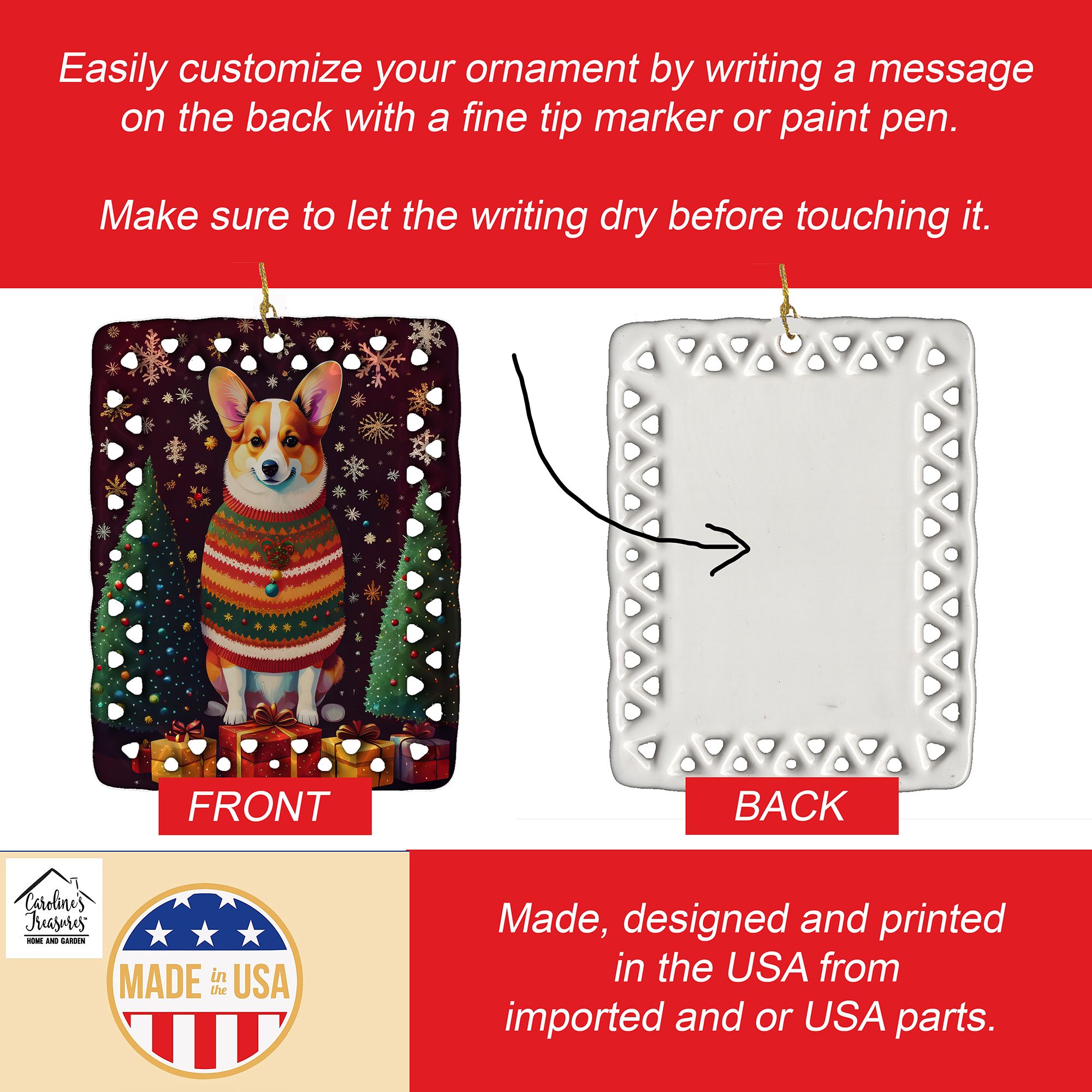 Porcelain Ornament featuring breed specific Corgi artwork. Celebrate Christmas with this Christmas Ornament. Add a unique, personal touch to your holiday decor with our Rectangular Lattice Porcelain Ornament. Perfect for creating cherished memories, this high-quality ornament shines under festive lights, reflecting warmth and joy throughout your Christmas tree. Crafted with a glossy finish, it showcases vibrant, full-color artwork contributed by our talented artists, ensuring your tree is adorned with a burst of color and holiday spirit. What sets this Porcelain Ornament apart is its customizable white back. Use a paint pen or permanent marker to write a heartfelt message, commemorate a special year, or mark an unforgettable date, turning this ornament into a keepsake that will be treasured for years to come. For best results, allow any personalization to dry thoroughly before handling. Each ornament comes complete with a delicate gold cord, making it easy to hang and display. Proudly made in the USA, this ornament measures 3.375 x 2.625 inches and is a thoughtful gift for pet sitters, teachers, family members, or anyone who would appreciate a little extra holiday magic. Bring style, charm, and a touch of personal meaning to your Christmas tree with this beautifully designed ornament..