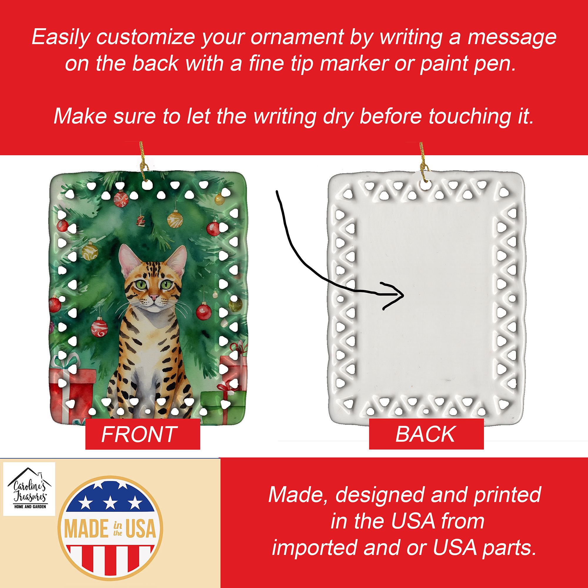 Porcelain Ornament featuring breed specific Bengal Cat artwork. Celebrate Christmas with this Christmas Ornament. Add a unique, personal touch to your holiday decor with our Rectangular Lattice Porcelain Ornament. Perfect for creating cherished memories, this high-quality ornament shines under festive lights, reflecting warmth and joy throughout your Christmas tree. Crafted with a glossy finish, it showcases vibrant, full-color artwork contributed by our talented artists, ensuring your tree is adorned with a burst of color and holiday spirit. What sets this Porcelain Ornament apart is its customizable white back. Use a paint pen or permanent marker to write a heartfelt message, commemorate a special year, or mark an unforgettable date, turning this ornament into a keepsake that will be treasured for years to come. For best results, allow any personalization to dry thoroughly before handling. Each ornament comes complete with a delicate gold cord, making it easy to hang and display. Proudly made in the USA, this ornament measures 3.375 x 2.625 inches and is a thoughtful gift for pet sitters, teachers, family members, or anyone who would appreciate a little extra holiday magic. Bring style, charm, and a touch of personal meaning to your Christmas tree with this beautifully designed ornament..