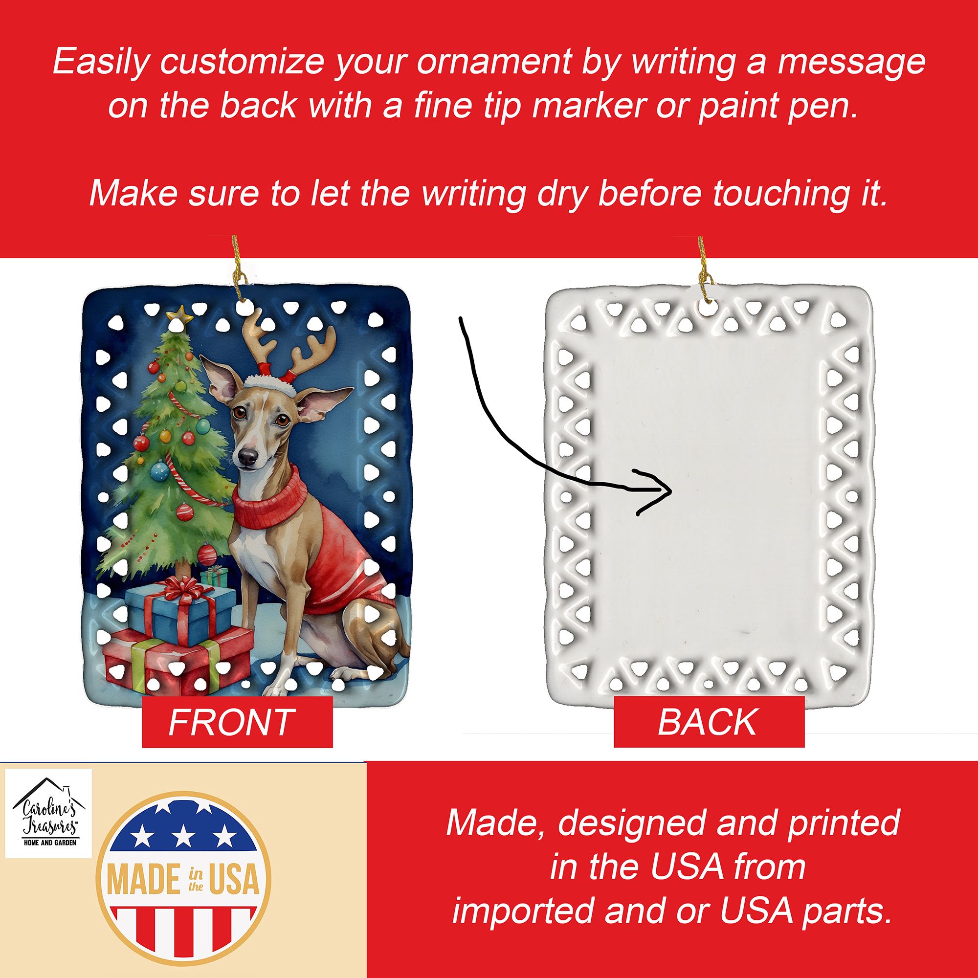 Porcelain Ornament featuring breed specific Italian Greyhound artwork. Celebrate Christmas with this Christmas Ornament. Add a unique, personal touch to your holiday decor with our Rectangular Lattice Porcelain Ornament. Perfect for creating cherished memories, this high-quality ornament shines under festive lights, reflecting warmth and joy throughout your Christmas tree. Crafted with a glossy finish, it showcases vibrant, full-color artwork contributed by our talented artists, ensuring your tree is adorned with a burst of color and holiday spirit. What sets this Porcelain Ornament apart is its customizable white back. Use a paint pen or permanent marker to write a heartfelt message, commemorate a special year, or mark an unforgettable date, turning this ornament into a keepsake that will be treasured for years to come. For best results, allow any personalization to dry thoroughly before handling. Each ornament comes complete with a delicate gold cord, making it easy to hang and display. Proudly made in the USA, this ornament measures 3.375 x 2.625 inches and is a thoughtful gift for pet sitters, teachers, family members, or anyone who would appreciate a little extra holiday magic. Bring style, charm, and a touch of personal meaning to your Christmas tree with this beautifully designed ornament..