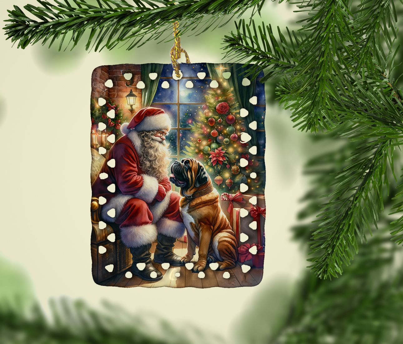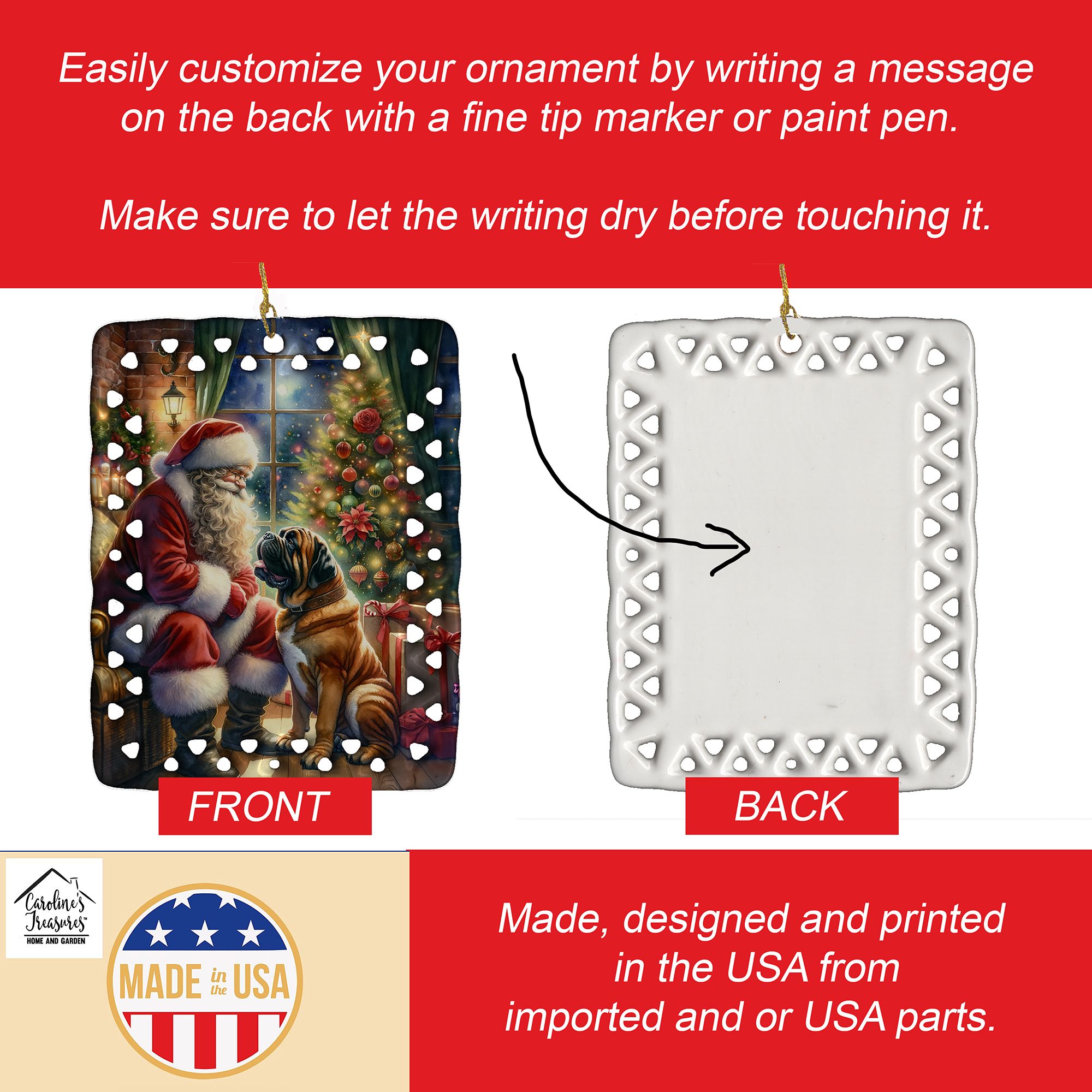 Porcelain Ornament featuring breed specific Bullmastiff artwork. Celebrate Christmas with this Christmas Ornament. Add a unique, personal touch to your holiday decor with our Rectangular Lattice Porcelain Ornament. Perfect for creating cherished memories, this high-quality ornament shines under festive lights, reflecting warmth and joy throughout your Christmas tree. Crafted with a glossy finish, it showcases vibrant, full-color artwork contributed by our talented artists, ensuring your tree is adorned with a burst of color and holiday spirit. What sets this Porcelain Ornament apart is its customizable white back. Use a paint pen or permanent marker to write a heartfelt message, commemorate a special year, or mark an unforgettable date, turning this ornament into a keepsake that will be treasured for years to come. For best results, allow any personalization to dry thoroughly before handling. Each ornament comes complete with a delicate gold cord, making it easy to hang and display. Proudly made in the USA, this ornament measures 3.375 x 2.625 inches and is a thoughtful gift for pet sitters, teachers, family members, or anyone who would appreciate a little extra holiday magic. Bring style, charm, and a touch of personal meaning to your Christmas tree with this beautifully designed ornament..