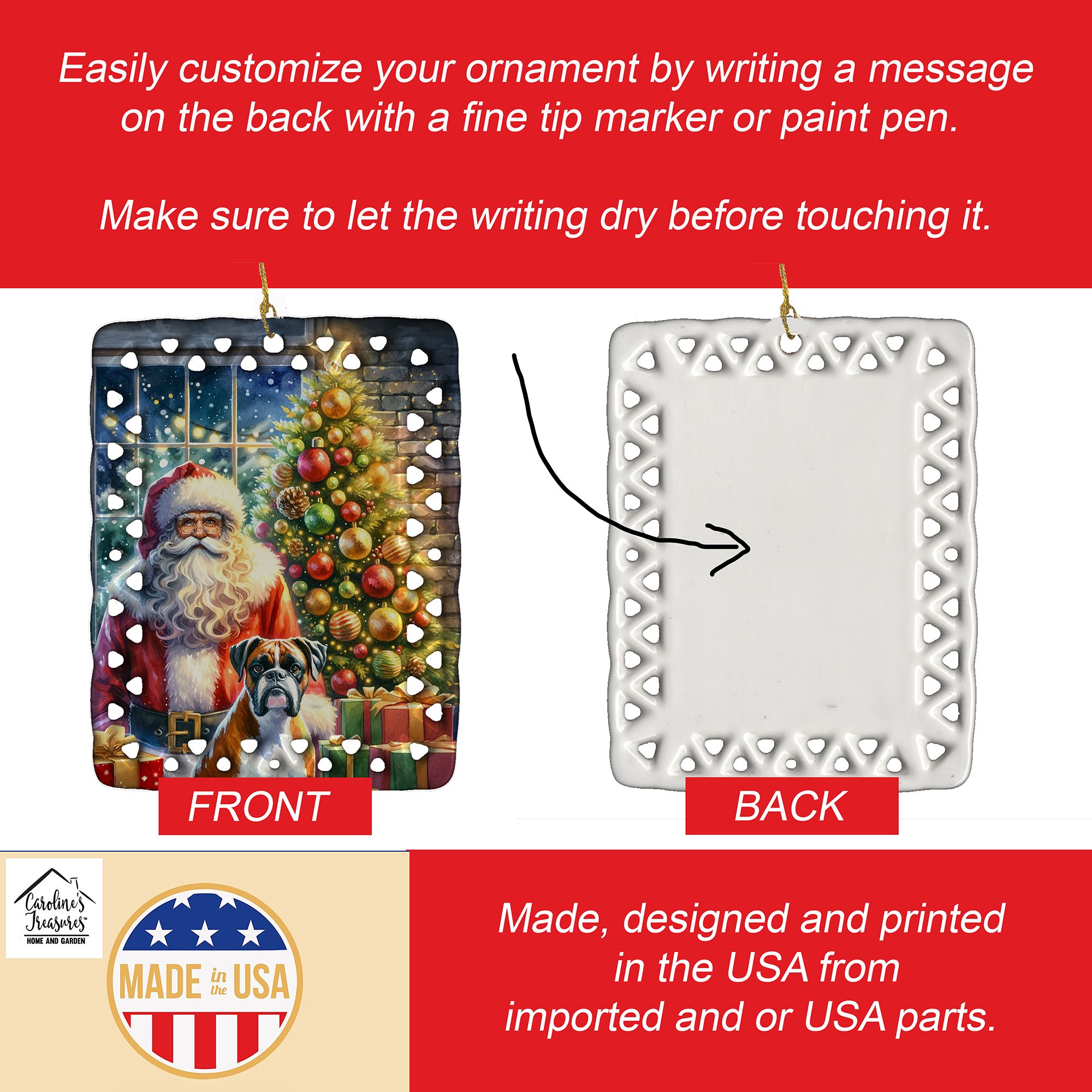 Porcelain Ornament featuring breed specific Boxer artwork. Celebrate Christmas with this Christmas Ornament. Add a unique, personal touch to your holiday decor with our Rectangular Lattice Porcelain Ornament. Perfect for creating cherished memories, this high-quality ornament shines under festive lights, reflecting warmth and joy throughout your Christmas tree. Crafted with a glossy finish, it showcases vibrant, full-color artwork contributed by our talented artists, ensuring your tree is adorned with a burst of color and holiday spirit. What sets this Porcelain Ornament apart is its customizable white back. Use a paint pen or permanent marker to write a heartfelt message, commemorate a special year, or mark an unforgettable date, turning this ornament into a keepsake that will be treasured for years to come. For best results, allow any personalization to dry thoroughly before handling. Each ornament comes complete with a delicate gold cord, making it easy to hang and display. Proudly made in the USA, this ornament measures 3.375 x 2.625 inches and is a thoughtful gift for pet sitters, teachers, family members, or anyone who would appreciate a little extra holiday magic. Bring style, charm, and a touch of personal meaning to your Christmas tree with this beautifully designed ornament..