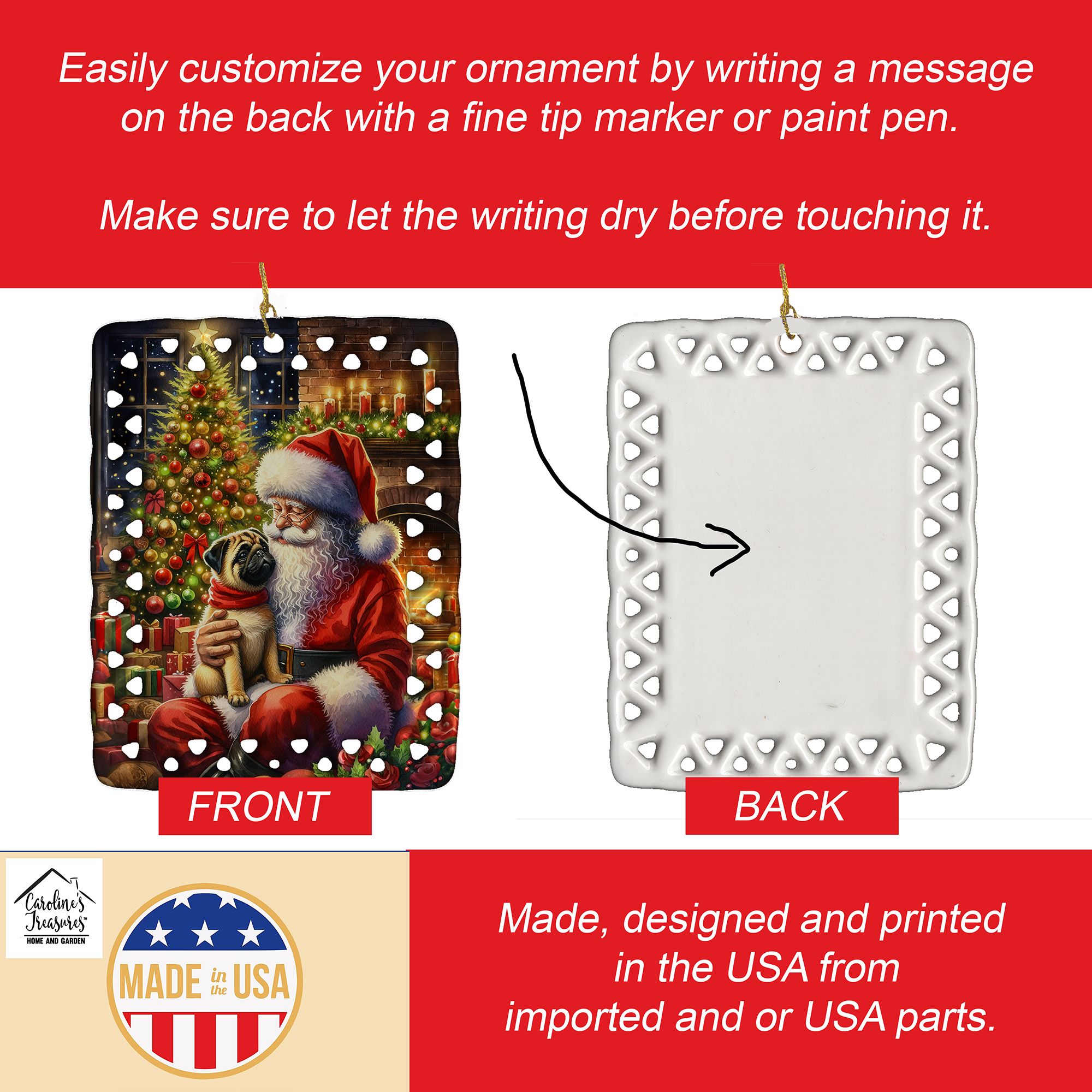 Porcelain Ornament featuring breed specific Pug artwork. Celebrate Christmas with this Christmas Ornament. Add a unique, personal touch to your holiday decor with our Rectangular Lattice Porcelain Ornament. Perfect for creating cherished memories, this high-quality ornament shines under festive lights, reflecting warmth and joy throughout your Christmas tree. Crafted with a glossy finish, it showcases vibrant, full-color artwork contributed by our talented artists, ensuring your tree is adorned with a burst of color and holiday spirit. What sets this Porcelain Ornament apart is its customizable white back. Use a paint pen or permanent marker to write a heartfelt message, commemorate a special year, or mark an unforgettable date, turning this ornament into a keepsake that will be treasured for years to come. For best results, allow any personalization to dry thoroughly before handling. Each ornament comes complete with a delicate gold cord, making it easy to hang and display. Proudly made in the USA, this ornament measures 3.375 x 2.625 inches and is a thoughtful gift for pet sitters, teachers, family members, or anyone who would appreciate a little extra holiday magic. Bring style, charm, and a touch of personal meaning to your Christmas tree with this beautifully designed ornament..