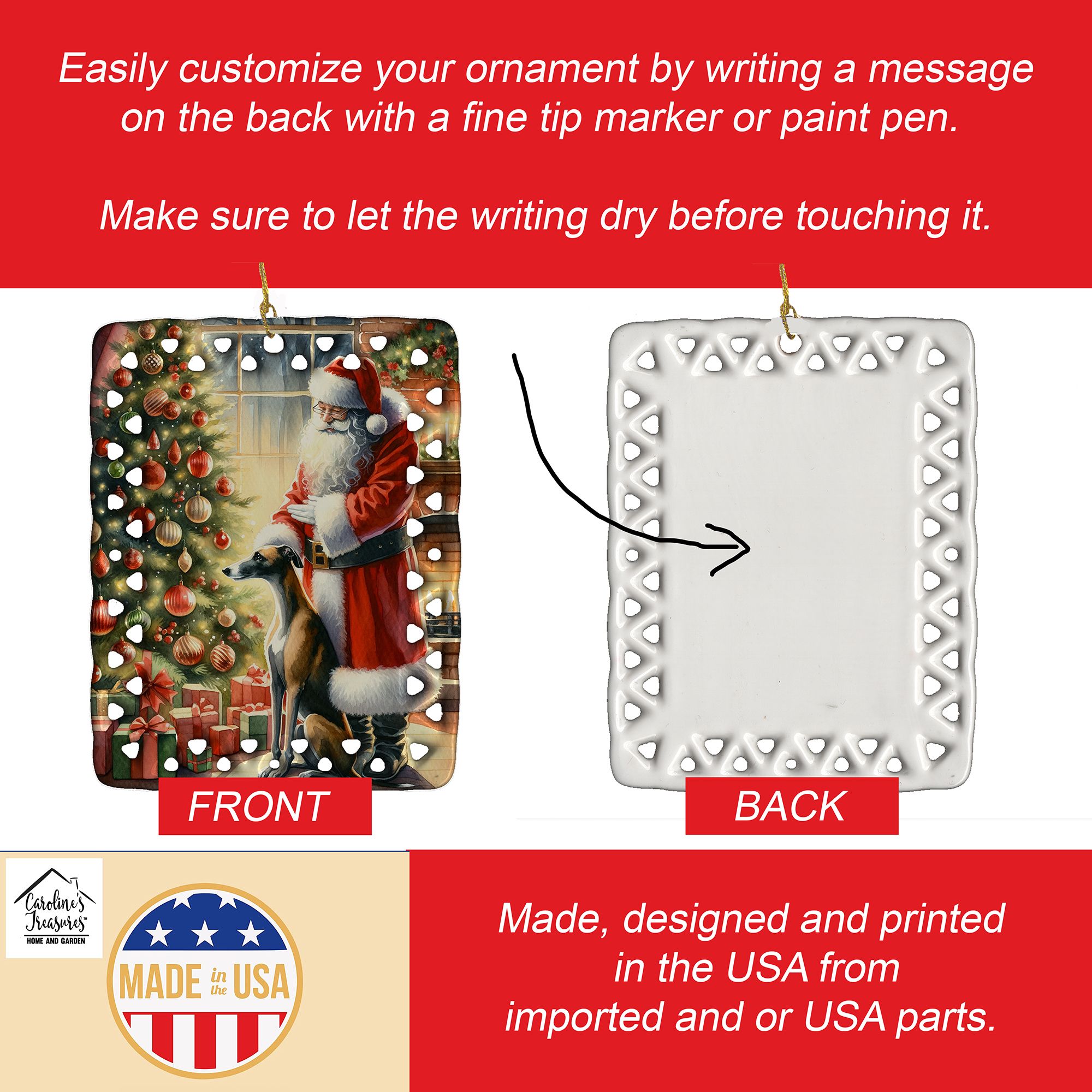 Porcelain Ornament featuring breed specific Greyhound artwork. Celebrate Christmas with this Christmas Ornament. Add a unique, personal touch to your holiday decor with our Rectangular Lattice Porcelain Ornament. Perfect for creating cherished memories, this high-quality ornament shines under festive lights, reflecting warmth and joy throughout your Christmas tree. Crafted with a glossy finish, it showcases vibrant, full-color artwork contributed by our talented artists, ensuring your tree is adorned with a burst of color and holiday spirit. What sets this Porcelain Ornament apart is its customizable white back. Use a paint pen or permanent marker to write a heartfelt message, commemorate a special year, or mark an unforgettable date, turning this ornament into a keepsake that will be treasured for years to come. For best results, allow any personalization to dry thoroughly before handling. Each ornament comes complete with a delicate gold cord, making it easy to hang and display. Proudly made in the USA, this ornament measures 3.375 x 2.625 inches and is a thoughtful gift for pet sitters, teachers, family members, or anyone who would appreciate a little extra holiday magic. Bring style, charm, and a touch of personal meaning to your Christmas tree with this beautifully designed ornament..