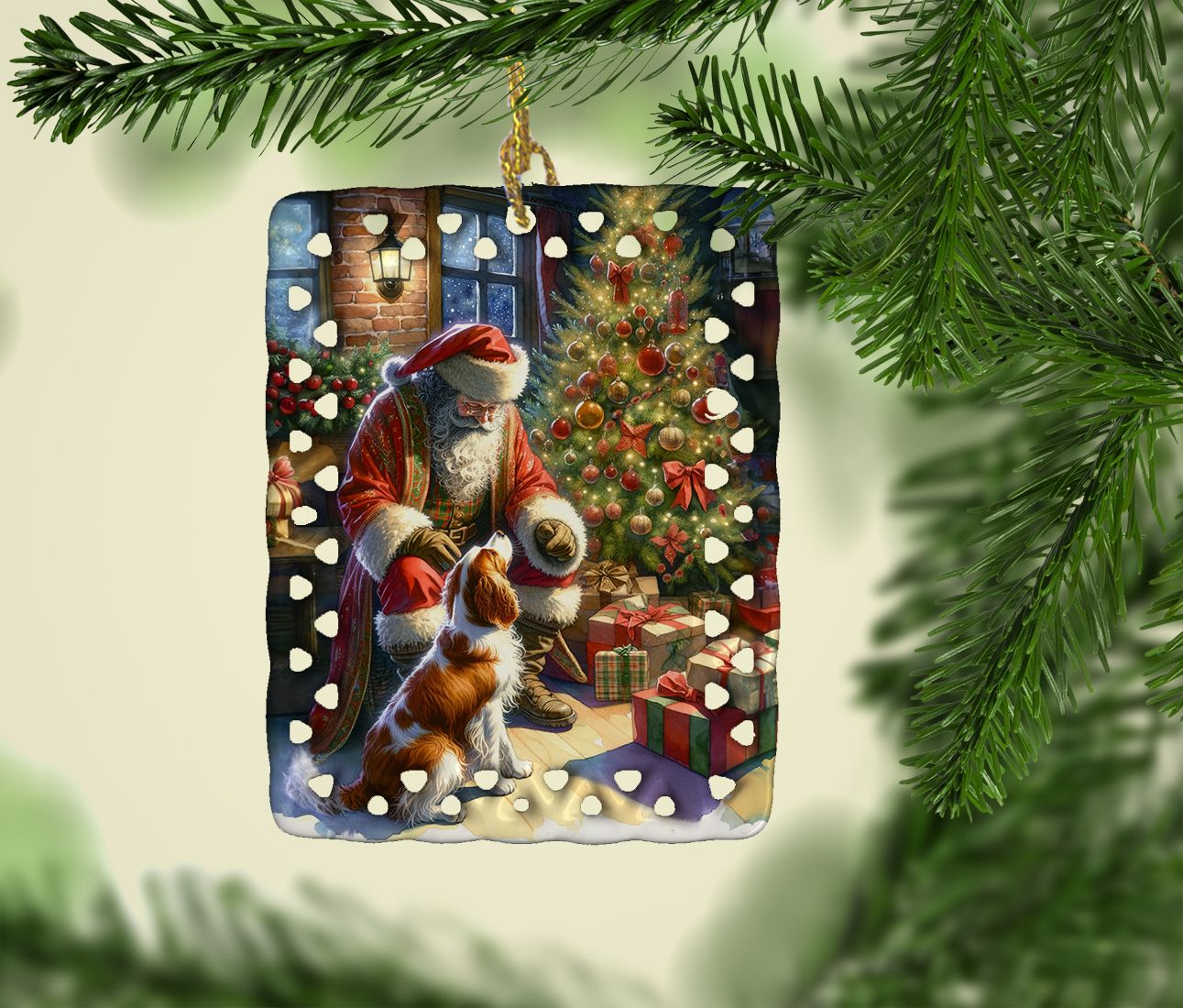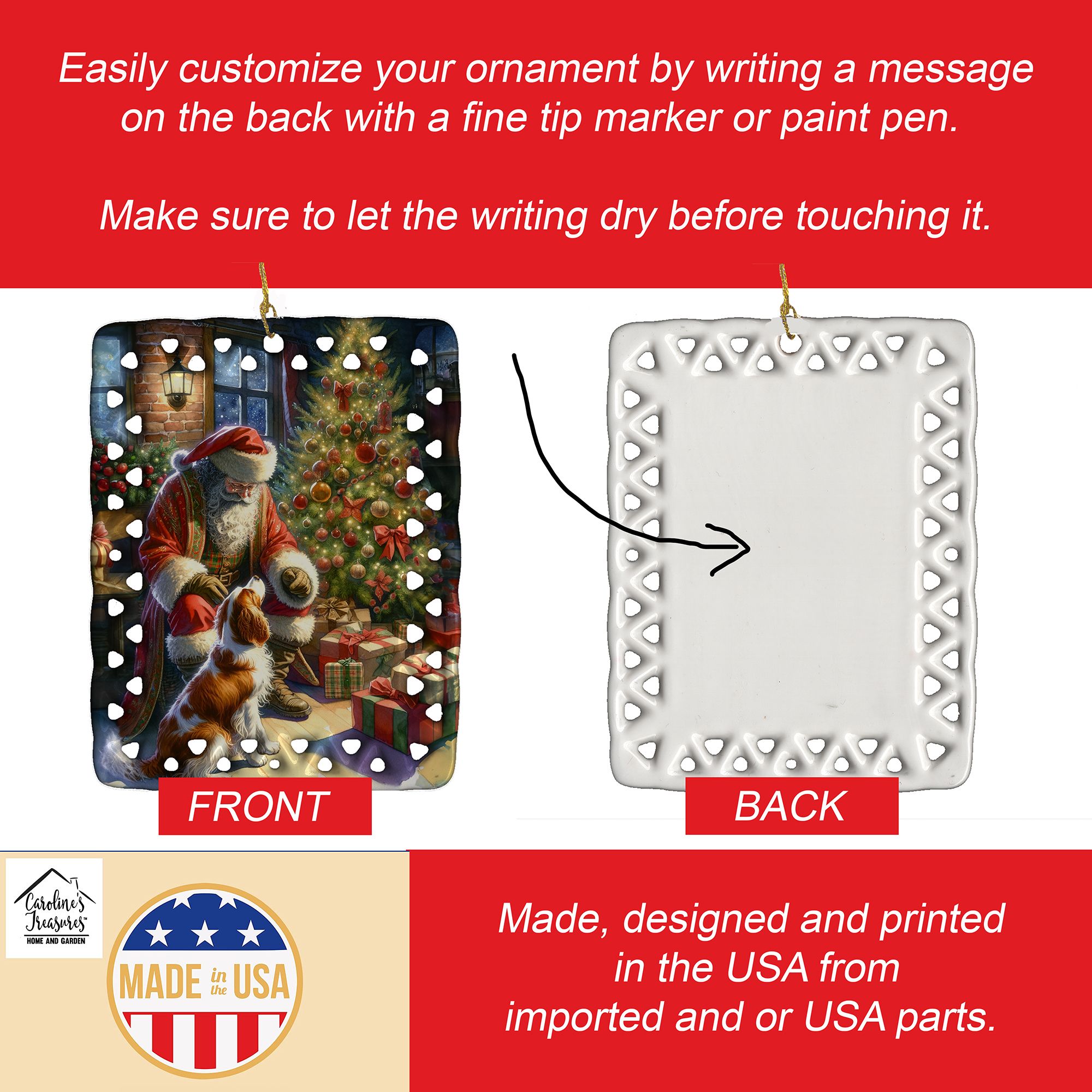 Porcelain Ornament featuring breed specific Brittany Spaniel artwork. Celebrate Christmas with this Christmas Ornament. Add a unique, personal touch to your holiday decor with our Rectangular Lattice Porcelain Ornament. Perfect for creating cherished memories, this high-quality ornament shines under festive lights, reflecting warmth and joy throughout your Christmas tree. Crafted with a glossy finish, it showcases vibrant, full-color artwork contributed by our talented artists, ensuring your tree is adorned with a burst of color and holiday spirit. What sets this Porcelain Ornament apart is its customizable white back. Use a paint pen or permanent marker to write a heartfelt message, commemorate a special year, or mark an unforgettable date, turning this ornament into a keepsake that will be treasured for years to come. For best results, allow any personalization to dry thoroughly before handling. Each ornament comes complete with a delicate gold cord, making it easy to hang and display. Proudly made in the USA, this ornament measures 3.375 x 2.625 inches and is a thoughtful gift for pet sitters, teachers, family members, or anyone who would appreciate a little extra holiday magic. Bring style, charm, and a touch of personal meaning to your Christmas tree with this beautifully designed ornament..