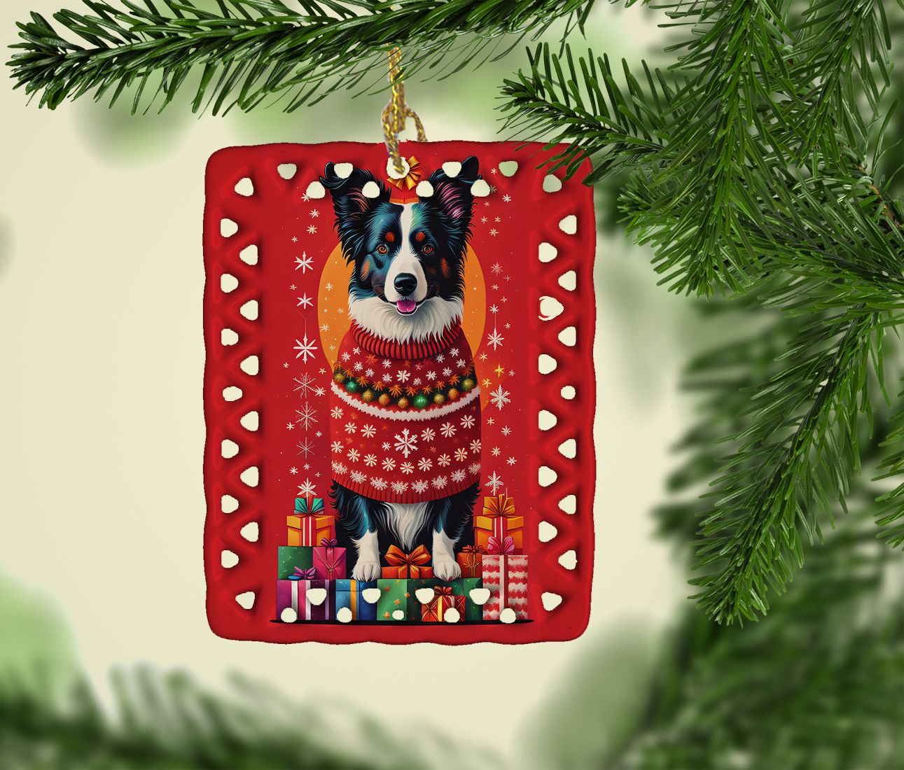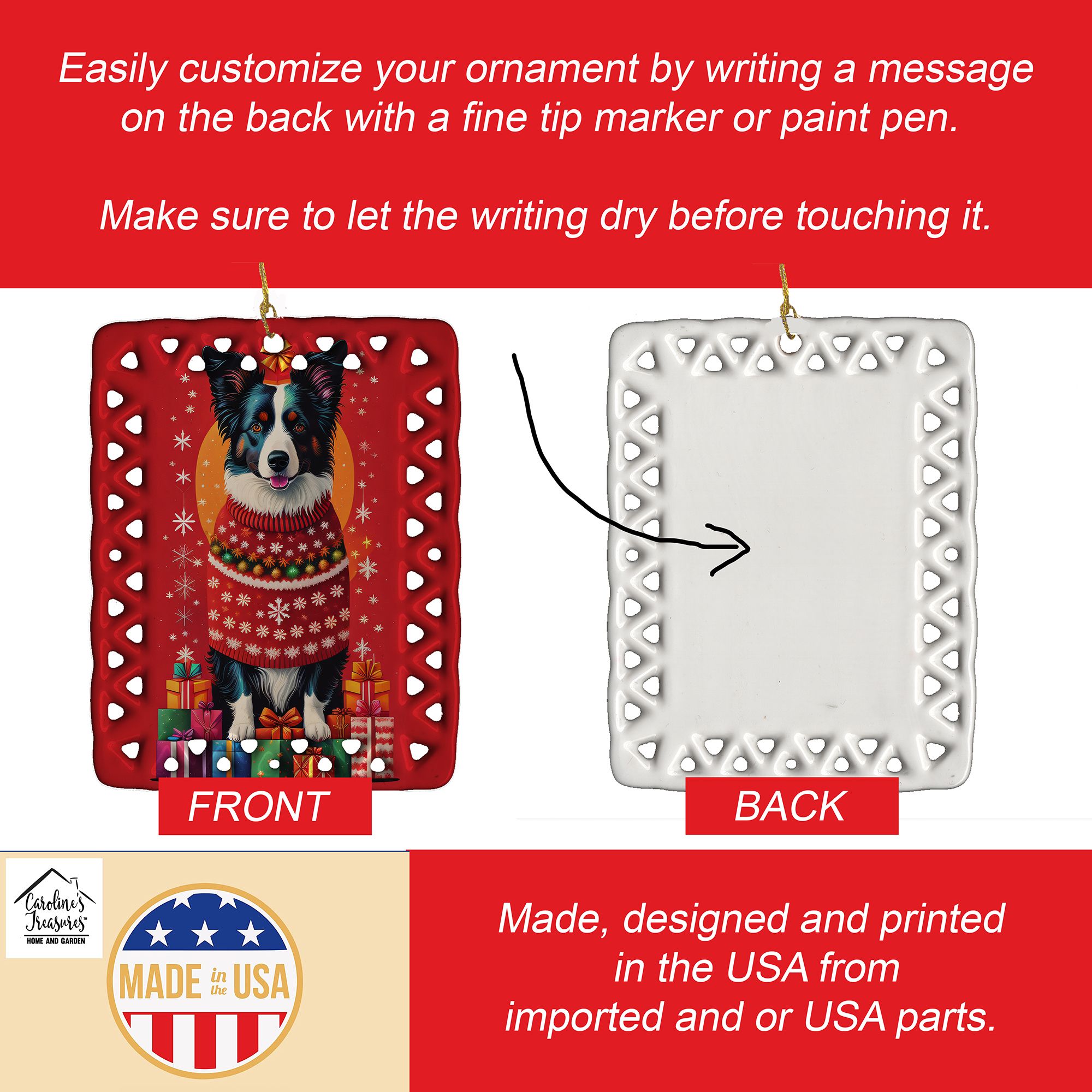 Porcelain Ornament featuring breed specific Border Collie artwork. Celebrate Christmas with this Christmas Ornament. Add a unique, personal touch to your holiday decor with our Rectangular Lattice Porcelain Ornament. Perfect for creating cherished memories, this high-quality ornament shines under festive lights, reflecting warmth and joy throughout your Christmas tree. Crafted with a glossy finish, it showcases vibrant, full-color artwork contributed by our talented artists, ensuring your tree is adorned with a burst of color and holiday spirit. What sets this Porcelain Ornament apart is its customizable white back. Use a paint pen or permanent marker to write a heartfelt message, commemorate a special year, or mark an unforgettable date, turning this ornament into a keepsake that will be treasured for years to come. For best results, allow any personalization to dry thoroughly before handling. Each ornament comes complete with a delicate gold cord, making it easy to hang and display. Proudly made in the USA, this ornament measures 3.375 x 2.625 inches and is a thoughtful gift for pet sitters, teachers, family members, or anyone who would appreciate a little extra holiday magic. Bring style, charm, and a touch of personal meaning to your Christmas tree with this beautifully designed ornament..