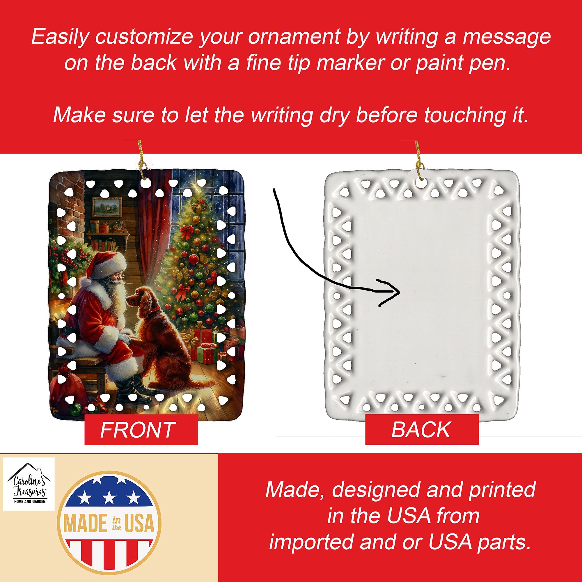 Porcelain Ornament featuring breed specific Irish Setter artwork. Celebrate Christmas with this Christmas Ornament. Add a unique, personal touch to your holiday decor with our Rectangular Lattice Porcelain Ornament. Perfect for creating cherished memories, this high-quality ornament shines under festive lights, reflecting warmth and joy throughout your Christmas tree. Crafted with a glossy finish, it showcases vibrant, full-color artwork contributed by our talented artists, ensuring your tree is adorned with a burst of color and holiday spirit. What sets this Porcelain Ornament apart is its customizable white back. Use a paint pen or permanent marker to write a heartfelt message, commemorate a special year, or mark an unforgettable date, turning this ornament into a keepsake that will be treasured for years to come. For best results, allow any personalization to dry thoroughly before handling. Each ornament comes complete with a delicate gold cord, making it easy to hang and display. Proudly made in the USA, this ornament measures 3.375 x 2.625 inches and is a thoughtful gift for pet sitters, teachers, family members, or anyone who would appreciate a little extra holiday magic. Bring style, charm, and a touch of personal meaning to your Christmas tree with this beautifully designed ornament..