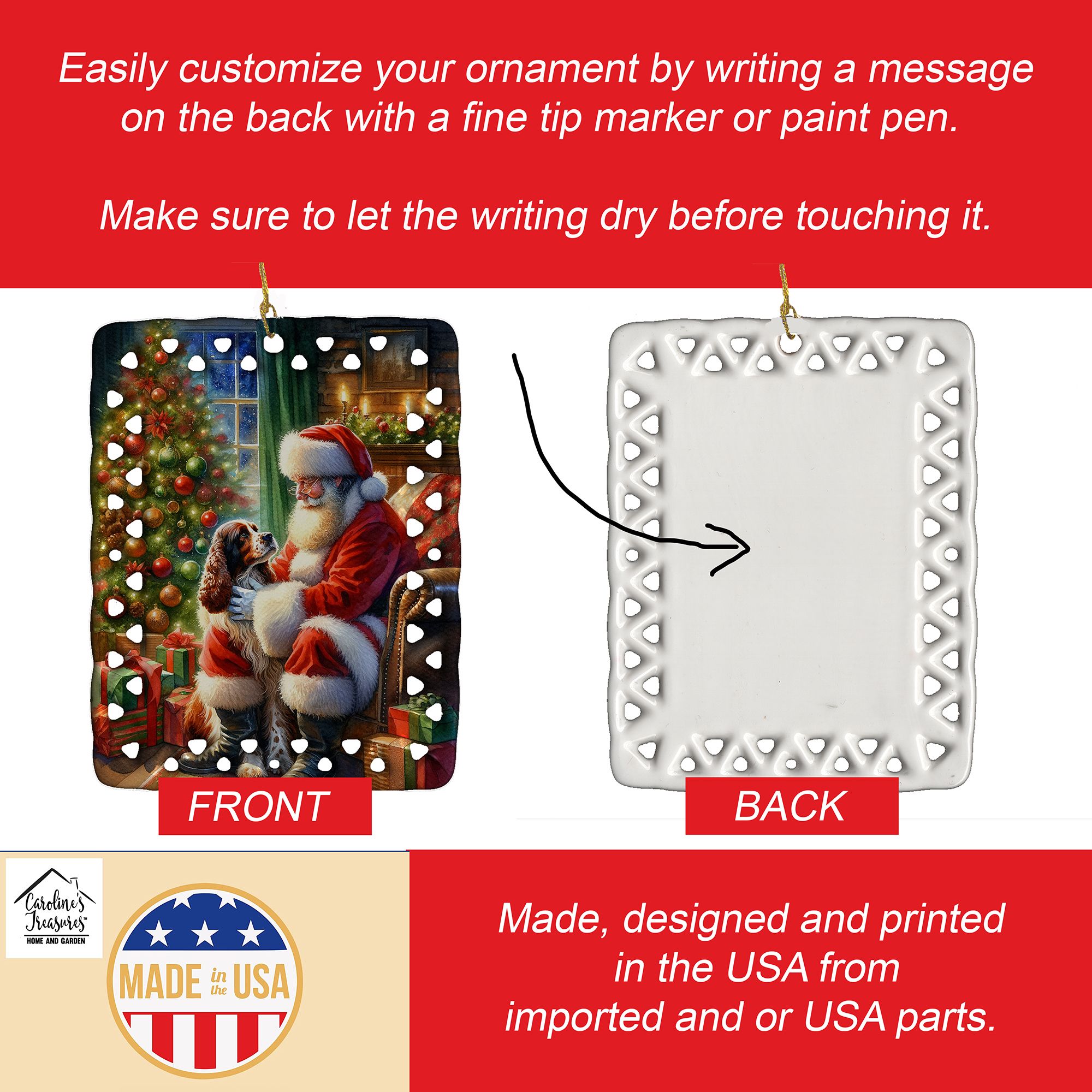 Porcelain Ornament featuring breed specific Welsh Springer Spaniel artwork. Celebrate Christmas with this Christmas Ornament. Add a unique, personal touch to your holiday decor with our Rectangular Lattice Porcelain Ornament. Perfect for creating cherished memories, this high-quality ornament shines under festive lights, reflecting warmth and joy throughout your Christmas tree. Crafted with a glossy finish, it showcases vibrant, full-color artwork contributed by our talented artists, ensuring your tree is adorned with a burst of color and holiday spirit. What sets this Porcelain Ornament apart is its customizable white back. Use a paint pen or permanent marker to write a heartfelt message, commemorate a special year, or mark an unforgettable date, turning this ornament into a keepsake that will be treasured for years to come. For best results, allow any personalization to dry thoroughly before handling. Each ornament comes complete with a delicate gold cord, making it easy to hang and display. Proudly made in the USA, this ornament measures 3.375 x 2.625 inches and is a thoughtful gift for pet sitters, teachers, family members, or anyone who would appreciate a little extra holiday magic. Bring style, charm, and a touch of personal meaning to your Christmas tree with this beautifully designed ornament..