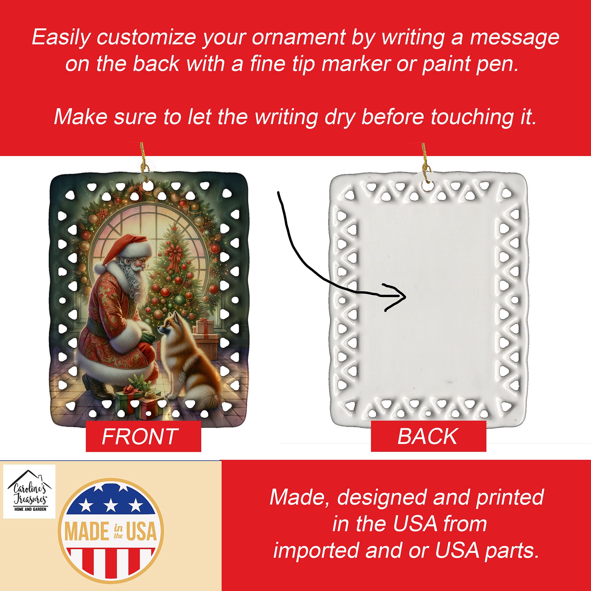 Porcelain Ornament featuring breed specific Finnish Spitz artwork. Celebrate Christmas with this Christmas Ornament. Add a unique, personal touch to your holiday decor with our Rectangular Lattice Porcelain Ornament. Perfect for creating cherished memories, this high-quality ornament shines under festive lights, reflecting warmth and joy throughout your Christmas tree. Crafted with a glossy finish, it showcases vibrant, full-color artwork contributed by our talented artists, ensuring your tree is adorned with a burst of color and holiday spirit. What sets this Porcelain Ornament apart is its customizable white back. Use a paint pen or permanent marker to write a heartfelt message, commemorate a special year, or mark an unforgettable date, turning this ornament into a keepsake that will be treasured for years to come. For best results, allow any personalization to dry thoroughly before handling. Each ornament comes complete with a delicate gold cord, making it easy to hang and display. Proudly made in the USA, this ornament measures 3.375 x 2.625 inches and is a thoughtful gift for pet sitters, teachers, family members, or anyone who would appreciate a little extra holiday magic. Bring style, charm, and a touch of personal meaning to your Christmas tree with this beautifully designed ornament..