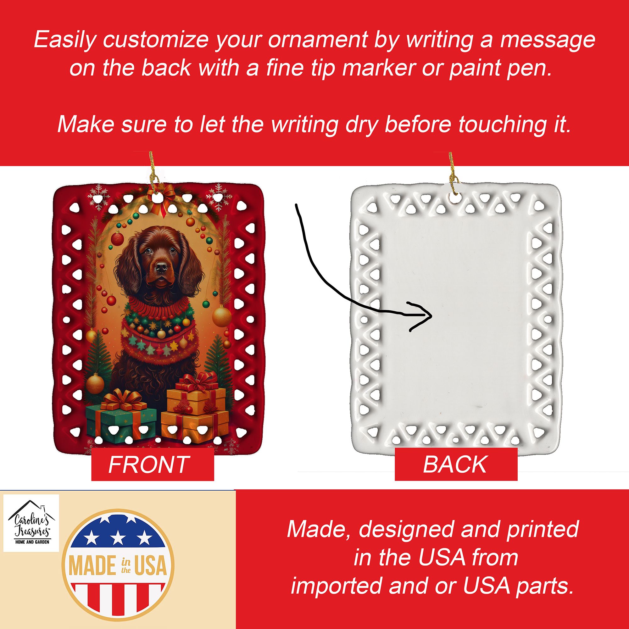 Porcelain Ornament featuring breed specific Boykin Spaniel artwork. Celebrate Christmas with this Christmas Ornament. Add a unique, personal touch to your holiday decor with our Rectangular Lattice Porcelain Ornament. Perfect for creating cherished memories, this high-quality ornament shines under festive lights, reflecting warmth and joy throughout your Christmas tree. Crafted with a glossy finish, it showcases vibrant, full-color artwork contributed by our talented artists, ensuring your tree is adorned with a burst of color and holiday spirit. What sets this Porcelain Ornament apart is its customizable white back. Use a paint pen or permanent marker to write a heartfelt message, commemorate a special year, or mark an unforgettable date, turning this ornament into a keepsake that will be treasured for years to come. For best results, allow any personalization to dry thoroughly before handling. Each ornament comes complete with a delicate gold cord, making it easy to hang and display. Proudly made in the USA, this ornament measures 3.375 x 2.625 inches and is a thoughtful gift for pet sitters, teachers, family members, or anyone who would appreciate a little extra holiday magic. Bring style, charm, and a touch of personal meaning to your Christmas tree with this beautifully designed ornament..