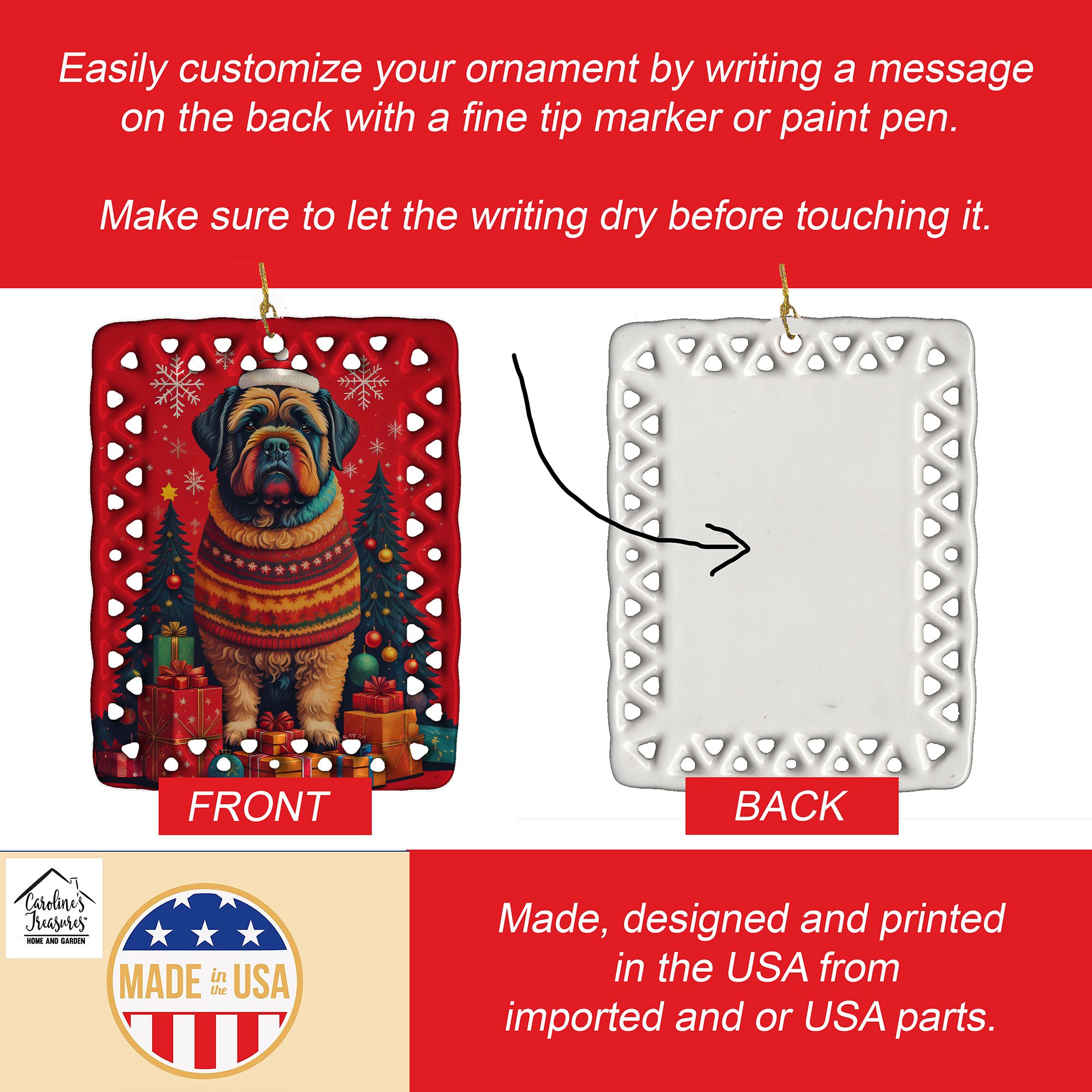 Porcelain Ornament featuring breed specific Bouvier des Flandres artwork. Celebrate Christmas with this Christmas Ornament. Add a unique, personal touch to your holiday decor with our Rectangular Lattice Porcelain Ornament. Perfect for creating cherished memories, this high-quality ornament shines under festive lights, reflecting warmth and joy throughout your Christmas tree. Crafted with a glossy finish, it showcases vibrant, full-color artwork contributed by our talented artists, ensuring your tree is adorned with a burst of color and holiday spirit. What sets this Porcelain Ornament apart is its customizable white back. Use a paint pen or permanent marker to write a heartfelt message, commemorate a special year, or mark an unforgettable date, turning this ornament into a keepsake that will be treasured for years to come. For best results, allow any personalization to dry thoroughly before handling. Each ornament comes complete with a delicate gold cord, making it easy to hang and display. Proudly made in the USA, this ornament measures 3.375 x 2.625 inches and is a thoughtful gift for pet sitters, teachers, family members, or anyone who would appreciate a little extra holiday magic. Bring style, charm, and a touch of personal meaning to your Christmas tree with this beautifully designed ornament..