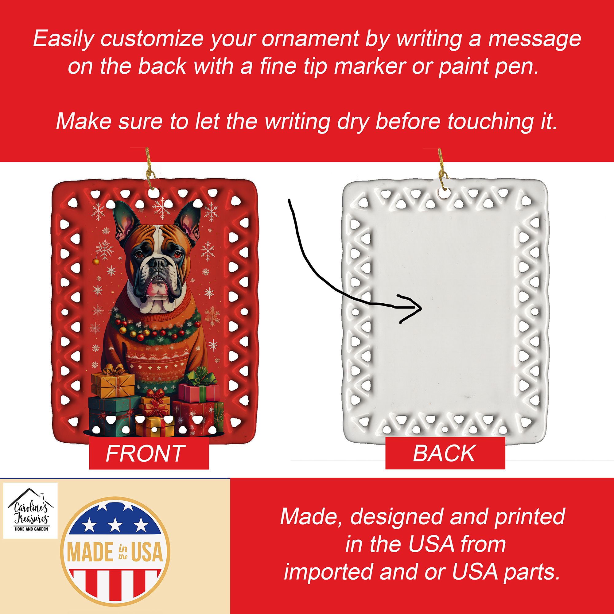 Porcelain Ornament featuring breed specific Boxer artwork. Celebrate Christmas with this Christmas Ornament. Add a unique, personal touch to your holiday decor with our Rectangular Lattice Porcelain Ornament. Perfect for creating cherished memories, this high-quality ornament shines under festive lights, reflecting warmth and joy throughout your Christmas tree. Crafted with a glossy finish, it showcases vibrant, full-color artwork contributed by our talented artists, ensuring your tree is adorned with a burst of color and holiday spirit. What sets this Porcelain Ornament apart is its customizable white back. Use a paint pen or permanent marker to write a heartfelt message, commemorate a special year, or mark an unforgettable date, turning this ornament into a keepsake that will be treasured for years to come. For best results, allow any personalization to dry thoroughly before handling. Each ornament comes complete with a delicate gold cord, making it easy to hang and display. Proudly made in the USA, this ornament measures 3.375 x 2.625 inches and is a thoughtful gift for pet sitters, teachers, family members, or anyone who would appreciate a little extra holiday magic. Bring style, charm, and a touch of personal meaning to your Christmas tree with this beautifully designed ornament..