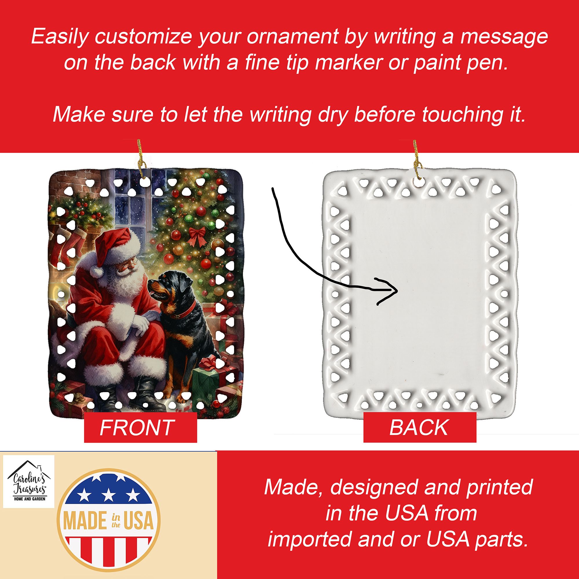 Porcelain Ornament featuring breed specific Rottweiler artwork. Celebrate Christmas with this Christmas Ornament. Add a unique, personal touch to your holiday decor with our Rectangular Lattice Porcelain Ornament. Perfect for creating cherished memories, this high-quality ornament shines under festive lights, reflecting warmth and joy throughout your Christmas tree. Crafted with a glossy finish, it showcases vibrant, full-color artwork contributed by our talented artists, ensuring your tree is adorned with a burst of color and holiday spirit. What sets this Porcelain Ornament apart is its customizable white back. Use a paint pen or permanent marker to write a heartfelt message, commemorate a special year, or mark an unforgettable date, turning this ornament into a keepsake that will be treasured for years to come. For best results, allow any personalization to dry thoroughly before handling. Each ornament comes complete with a delicate gold cord, making it easy to hang and display. Proudly made in the USA, this ornament measures 3.375 x 2.625 inches and is a thoughtful gift for pet sitters, teachers, family members, or anyone who would appreciate a little extra holiday magic. Bring style, charm, and a touch of personal meaning to your Christmas tree with this beautifully designed ornament..