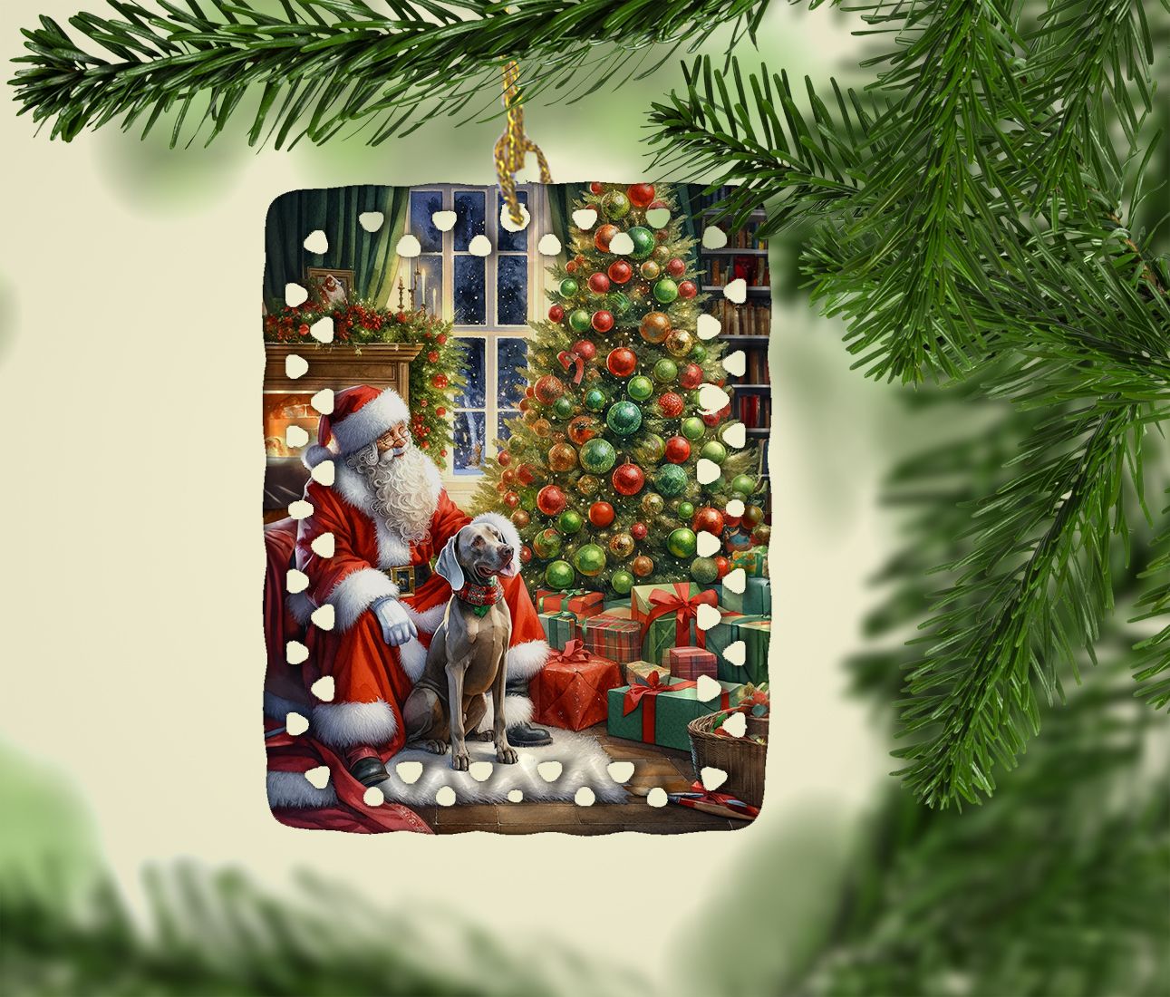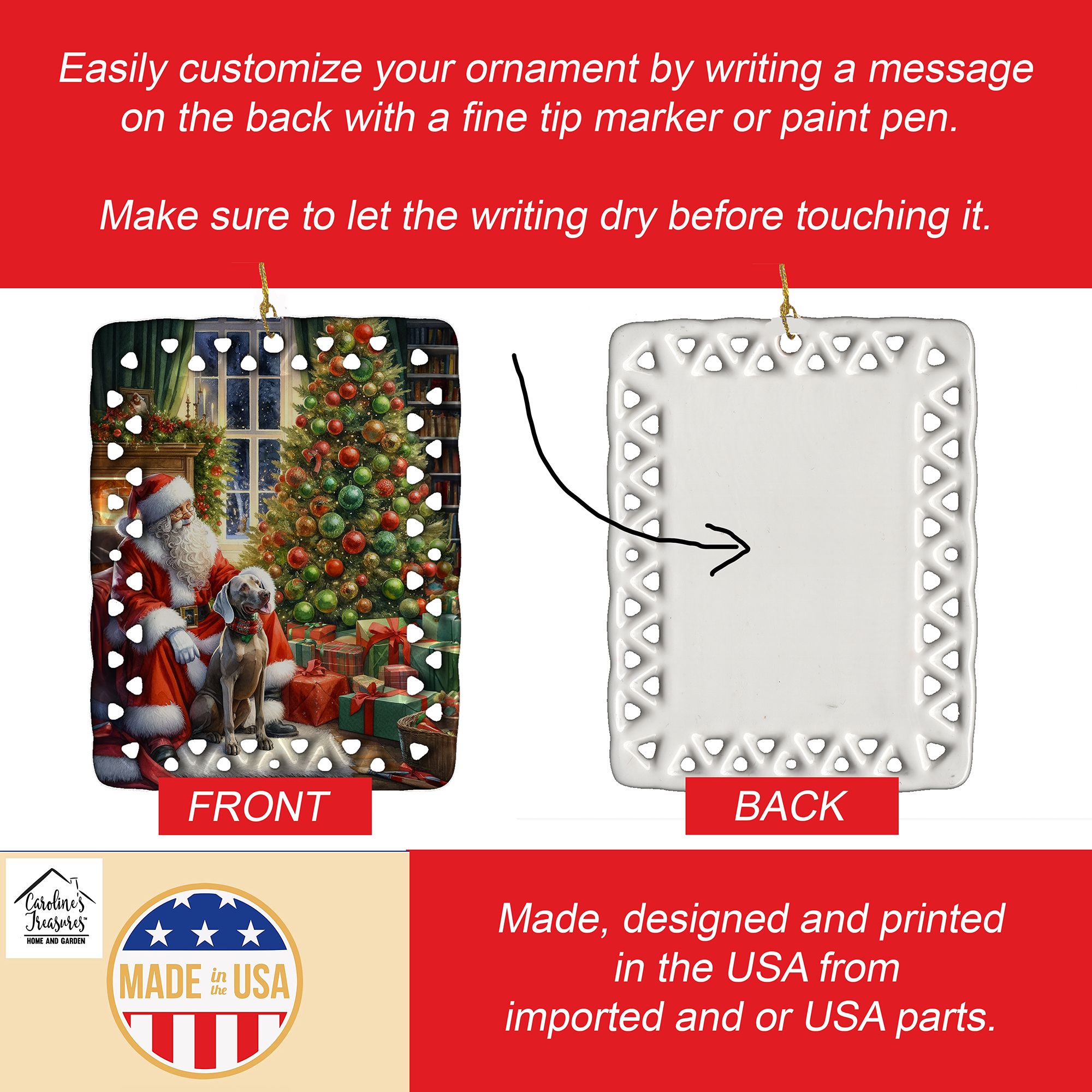 Porcelain Ornament featuring breed specific Weimaraner artwork. Celebrate Christmas with this Christmas Ornament. Add a unique, personal touch to your holiday decor with our Rectangular Lattice Porcelain Ornament. Perfect for creating cherished memories, this high-quality ornament shines under festive lights, reflecting warmth and joy throughout your Christmas tree. Crafted with a glossy finish, it showcases vibrant, full-color artwork contributed by our talented artists, ensuring your tree is adorned with a burst of color and holiday spirit. What sets this Porcelain Ornament apart is its customizable white back. Use a paint pen or permanent marker to write a heartfelt message, commemorate a special year, or mark an unforgettable date, turning this ornament into a keepsake that will be treasured for years to come. For best results, allow any personalization to dry thoroughly before handling. Each ornament comes complete with a delicate gold cord, making it easy to hang and display. Proudly made in the USA, this ornament measures 3.375 x 2.625 inches and is a thoughtful gift for pet sitters, teachers, family members, or anyone who would appreciate a little extra holiday magic. Bring style, charm, and a touch of personal meaning to your Christmas tree with this beautifully designed ornament..