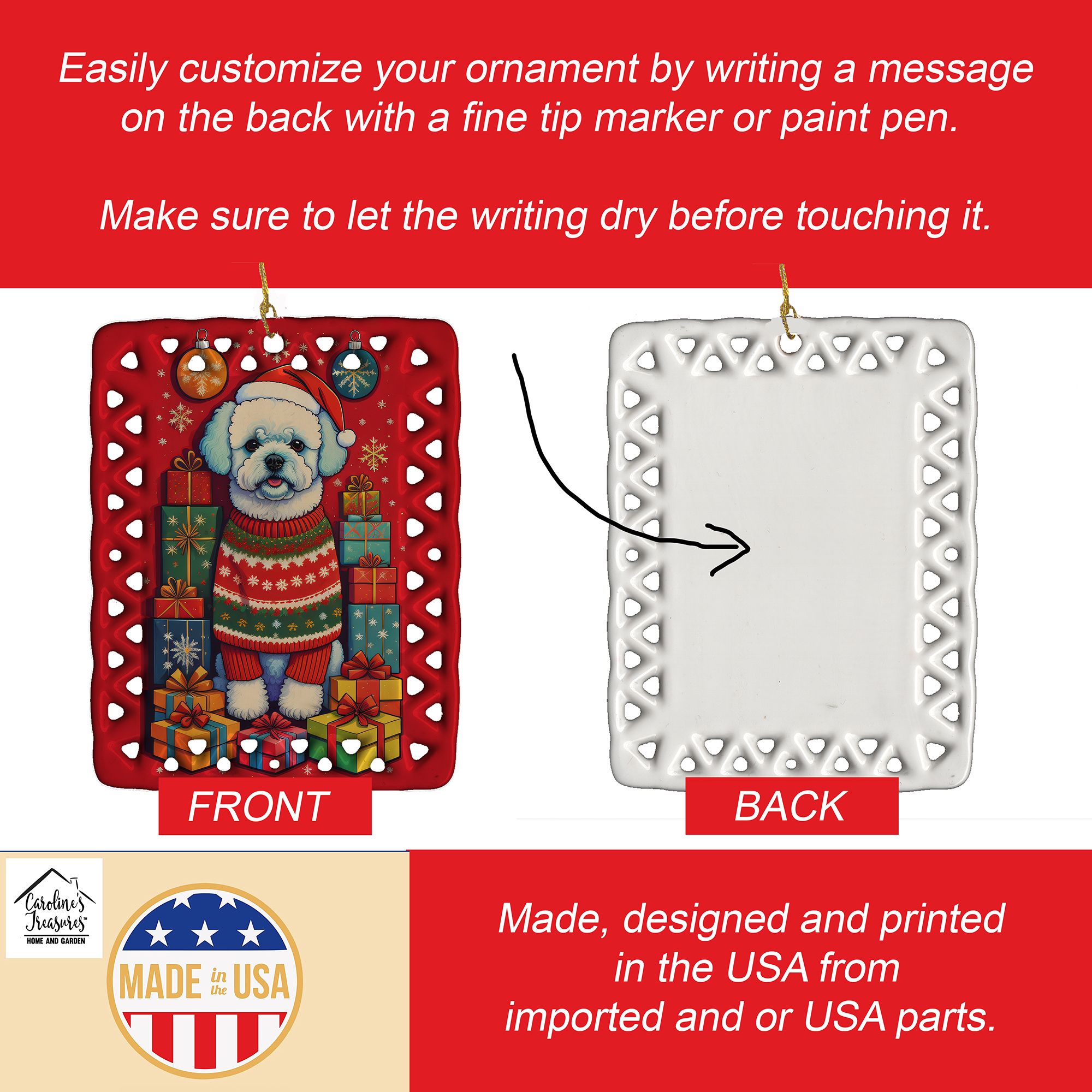 Porcelain Ornament featuring breed specific Bichon Frise artwork. Celebrate Christmas with this Christmas Ornament. Add a unique, personal touch to your holiday decor with our Rectangular Lattice Porcelain Ornament. Perfect for creating cherished memories, this high-quality ornament shines under festive lights, reflecting warmth and joy throughout your Christmas tree. Crafted with a glossy finish, it showcases vibrant, full-color artwork contributed by our talented artists, ensuring your tree is adorned with a burst of color and holiday spirit. What sets this Porcelain Ornament apart is its customizable white back. Use a paint pen or permanent marker to write a heartfelt message, commemorate a special year, or mark an unforgettable date, turning this ornament into a keepsake that will be treasured for years to come. For best results, allow any personalization to dry thoroughly before handling. Each ornament comes complete with a delicate gold cord, making it easy to hang and display. Proudly made in the USA, this ornament measures 3.375 x 2.625 inches and is a thoughtful gift for pet sitters, teachers, family members, or anyone who would appreciate a little extra holiday magic. Bring style, charm, and a touch of personal meaning to your Christmas tree with this beautifully designed ornament..