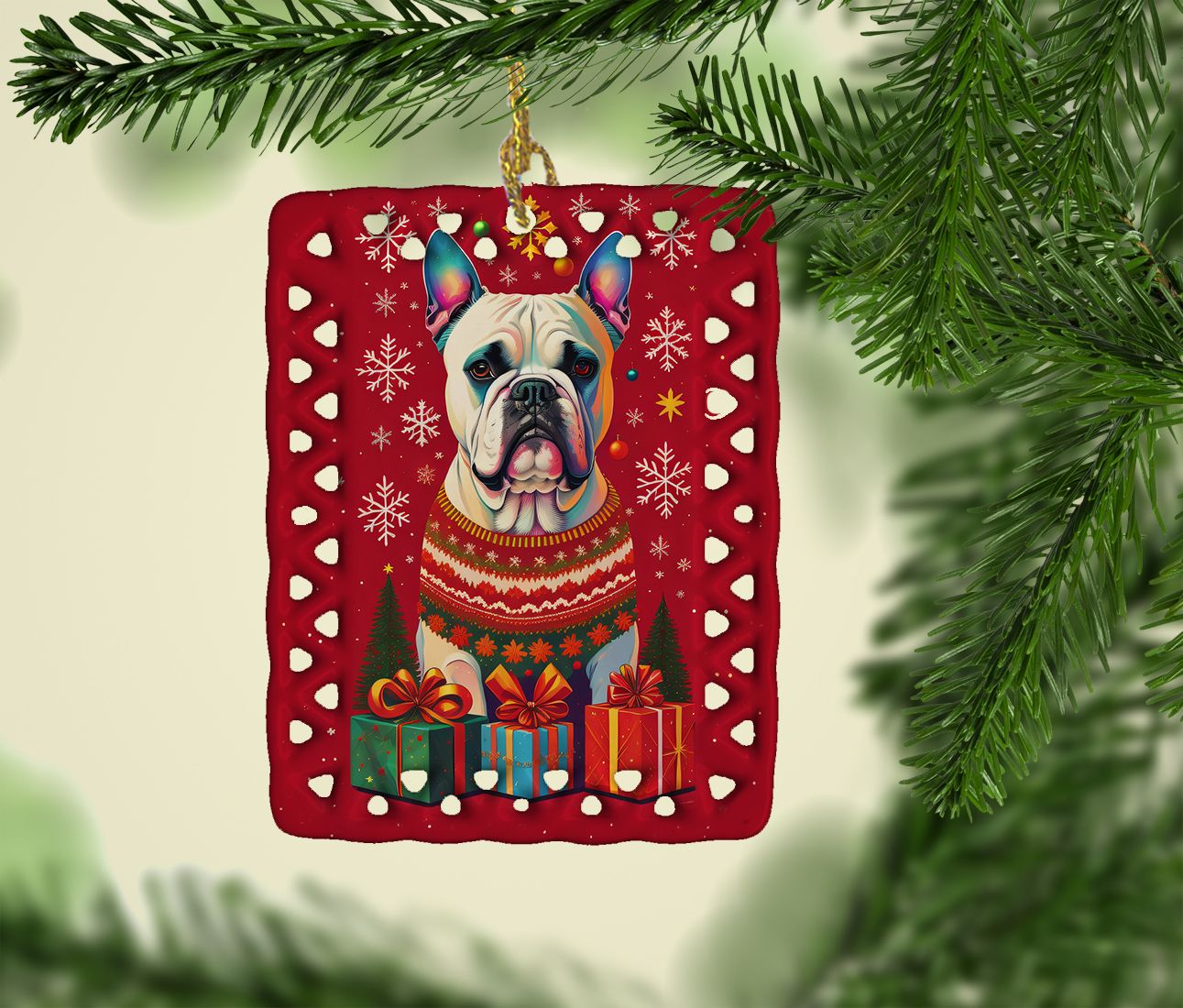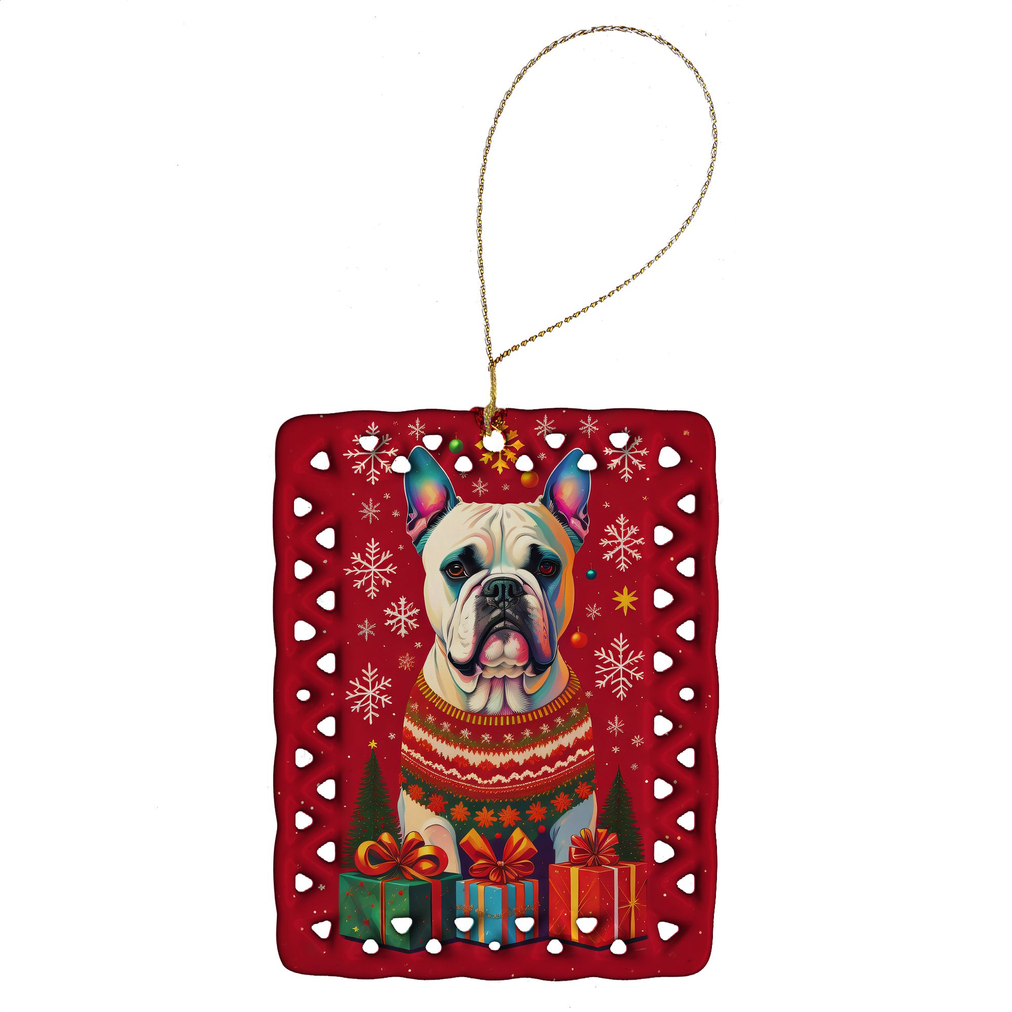 Porcelain Ornament featuring breed specific Boxer artwork. Celebrate Christmas with this Christmas Ornament. Add a unique, personal touch to your holiday decor with our Rectangular Lattice Porcelain Ornament. Perfect for creating cherished memories, this high-quality ornament shines under festive lights, reflecting warmth and joy throughout your Christmas tree. Crafted with a glossy finish, it showcases vibrant, full-color artwork contributed by our talented artists, ensuring your tree is adorned with a burst of color and holiday spirit. What sets this Porcelain Ornament apart is its customizable white back. Use a paint pen or permanent marker to write a heartfelt message, commemorate a special year, or mark an unforgettable date, turning this ornament into a keepsake that will be treasured for years to come. For best results, allow any personalization to dry thoroughly before handling. Each ornament comes complete with a delicate gold cord, making it easy to hang and display. Proudly made in the USA, this ornament measures 3.375 x 2.625 inches and is a thoughtful gift for pet sitters, teachers, family members, or anyone who would appreciate a little extra holiday magic. Bring style, charm, and a touch of personal meaning to your Christmas tree with this beautifully designed ornament..