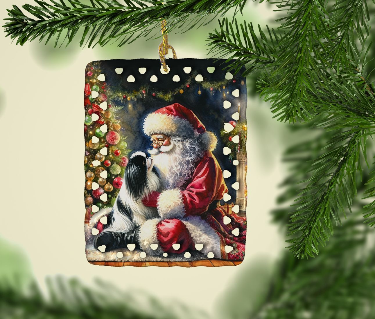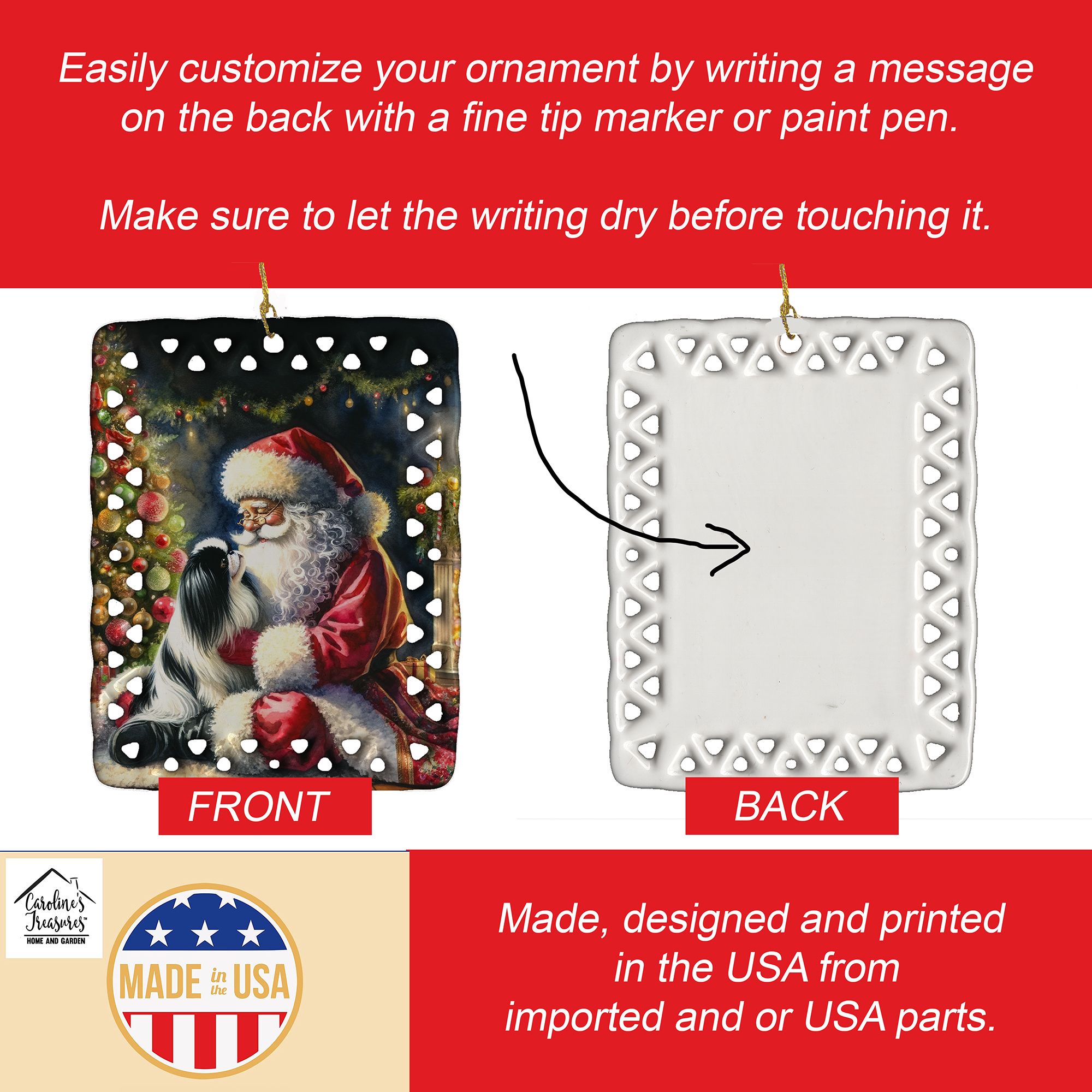 Porcelain Ornament featuring breed specific Japanese Chin artwork. Celebrate Christmas with this Christmas Ornament. Add a unique, personal touch to your holiday decor with our Rectangular Lattice Porcelain Ornament. Perfect for creating cherished memories, this high-quality ornament shines under festive lights, reflecting warmth and joy throughout your Christmas tree. Crafted with a glossy finish, it showcases vibrant, full-color artwork contributed by our talented artists, ensuring your tree is adorned with a burst of color and holiday spirit. What sets this Porcelain Ornament apart is its customizable white back. Use a paint pen or permanent marker to write a heartfelt message, commemorate a special year, or mark an unforgettable date, turning this ornament into a keepsake that will be treasured for years to come. For best results, allow any personalization to dry thoroughly before handling. Each ornament comes complete with a delicate gold cord, making it easy to hang and display. Proudly made in the USA, this ornament measures 3.375 x 2.625 inches and is a thoughtful gift for pet sitters, teachers, family members, or anyone who would appreciate a little extra holiday magic. Bring style, charm, and a touch of personal meaning to your Christmas tree with this beautifully designed ornament..