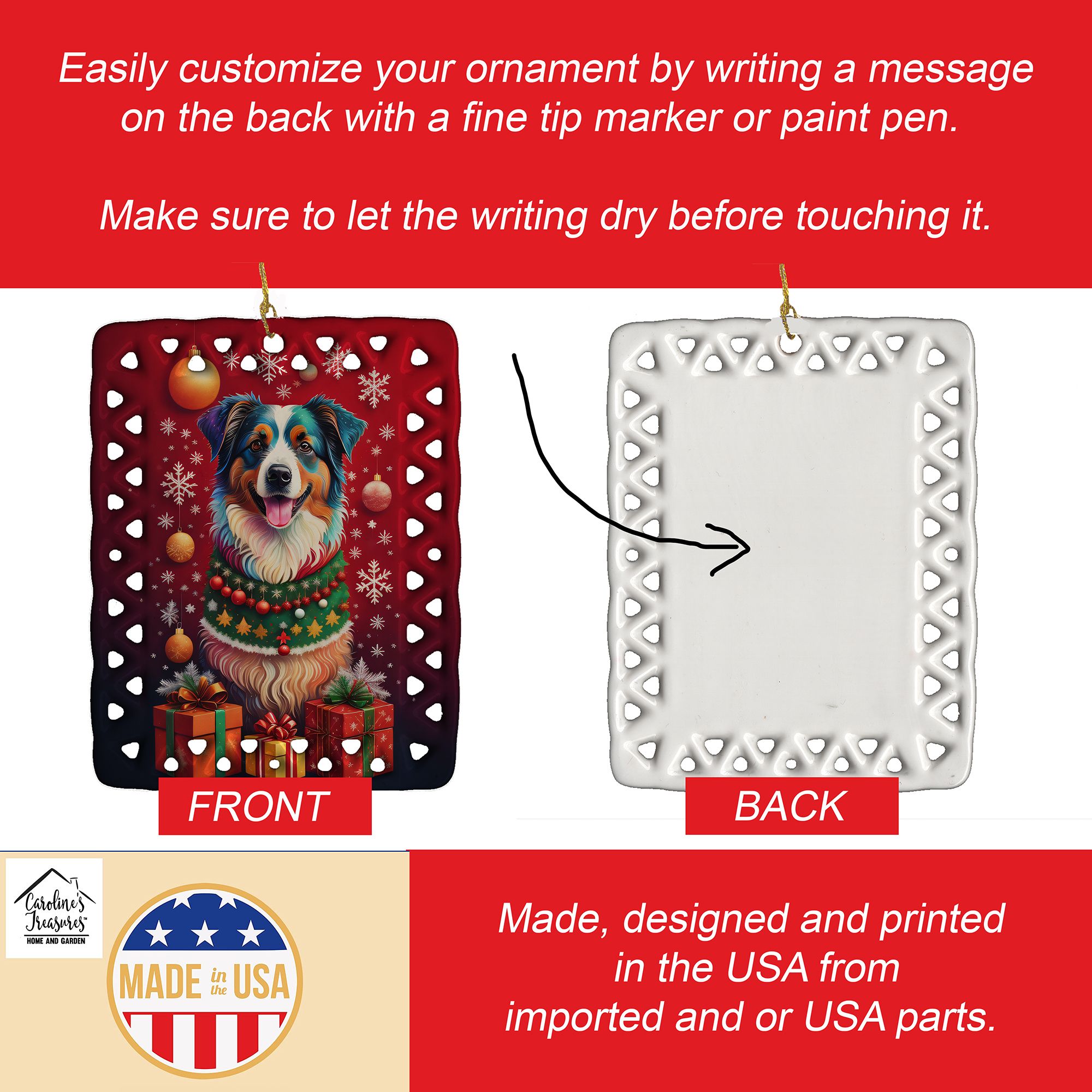 Porcelain Ornament featuring breed specific Australian Shepherd artwork. Celebrate Christmas with this Christmas Ornament. Add a unique, personal touch to your holiday decor with our Rectangular Lattice Porcelain Ornament. Perfect for creating cherished memories, this high-quality ornament shines under festive lights, reflecting warmth and joy throughout your Christmas tree. Crafted with a glossy finish, it showcases vibrant, full-color artwork contributed by our talented artists, ensuring your tree is adorned with a burst of color and holiday spirit. What sets this Porcelain Ornament apart is its customizable white back. Use a paint pen or permanent marker to write a heartfelt message, commemorate a special year, or mark an unforgettable date, turning this ornament into a keepsake that will be treasured for years to come. For best results, allow any personalization to dry thoroughly before handling. Each ornament comes complete with a delicate gold cord, making it easy to hang and display. Proudly made in the USA, this ornament measures 3.375 x 2.625 inches and is a thoughtful gift for pet sitters, teachers, family members, or anyone who would appreciate a little extra holiday magic. Bring style, charm, and a touch of personal meaning to your Christmas tree with this beautifully designed ornament..