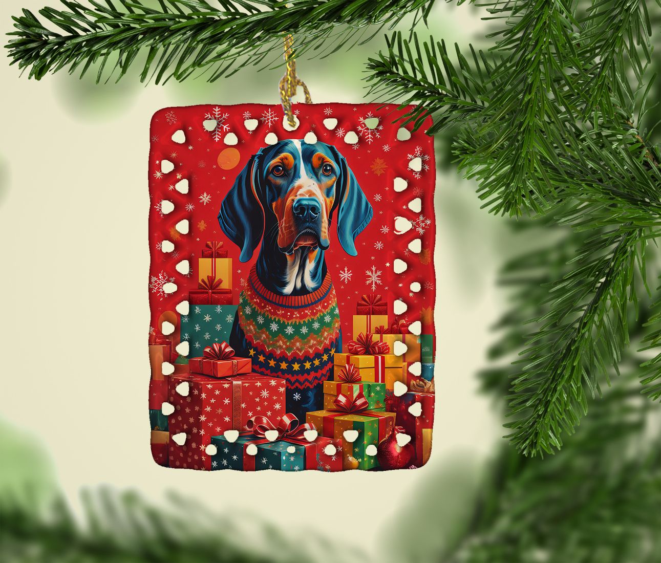 Porcelain Ornament featuring breed specific American English Coonhound artwork. Celebrate Christmas with this Christmas Ornament. Add a unique, personal touch to your holiday decor with our Rectangular Lattice Porcelain Ornament. Perfect for creating cherished memories, this high-quality ornament shines under festive lights, reflecting warmth and joy throughout your Christmas tree. Crafted with a glossy finish, it showcases vibrant, full-color artwork contributed by our talented artists, ensuring your tree is adorned with a burst of color and holiday spirit. What sets this Porcelain Ornament apart is its customizable white back. Use a paint pen or permanent marker to write a heartfelt message, commemorate a special year, or mark an unforgettable date, turning this ornament into a keepsake that will be treasured for years to come. For best results, allow any personalization to dry thoroughly before handling. Each ornament comes complete with a delicate gold cord, making it easy to hang and display. Proudly made in the USA, this ornament measures 3.375 x 2.625 inches and is a thoughtful gift for pet sitters, teachers, family members, or anyone who would appreciate a little extra holiday magic. Bring style, charm, and a touch of personal meaning to your Christmas tree with this beautifully designed ornament..