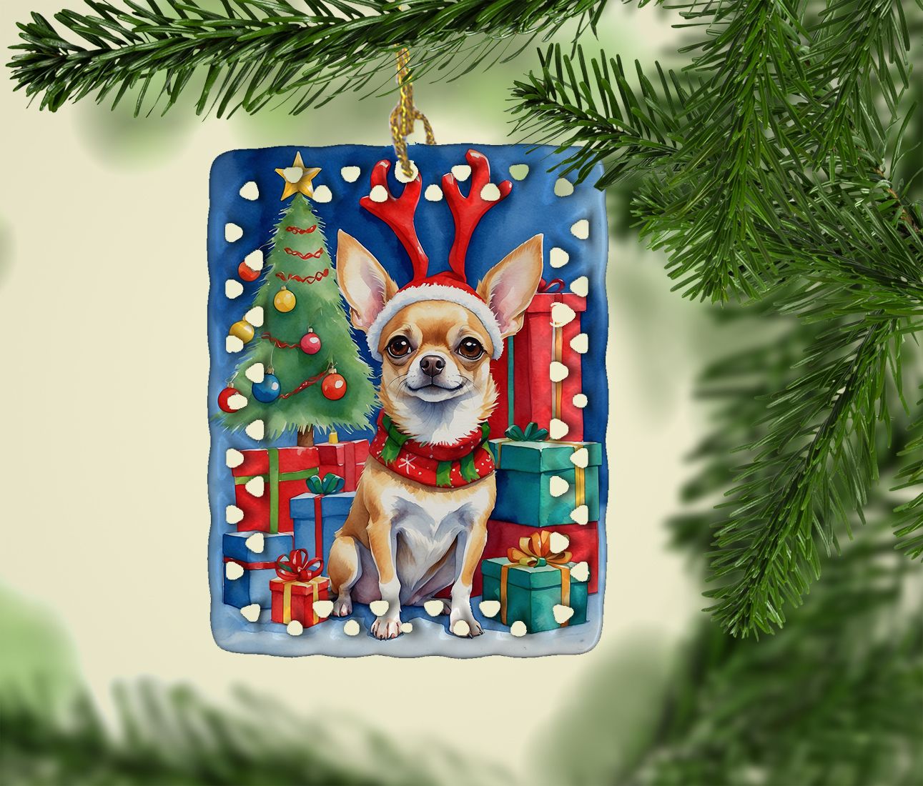 Porcelain Ornament featuring breed specific Chihuahua artwork. Celebrate Christmas with this Christmas Ornament. Add a unique, personal touch to your holiday decor with our Rectangular Lattice Porcelain Ornament. Perfect for creating cherished memories, this high-quality ornament shines under festive lights, reflecting warmth and joy throughout your Christmas tree. Crafted with a glossy finish, it showcases vibrant, full-color artwork contributed by our talented artists, ensuring your tree is adorned with a burst of color and holiday spirit. What sets this Porcelain Ornament apart is its customizable white back. Use a paint pen or permanent marker to write a heartfelt message, commemorate a special year, or mark an unforgettable date, turning this ornament into a keepsake that will be treasured for years to come. For best results, allow any personalization to dry thoroughly before handling. Each ornament comes complete with a delicate gold cord, making it easy to hang and display. Proudly made in the USA, this ornament measures 3.375 x 2.625 inches and is a thoughtful gift for pet sitters, teachers, family members, or anyone who would appreciate a little extra holiday magic. Bring style, charm, and a touch of personal meaning to your Christmas tree with this beautifully designed ornament..